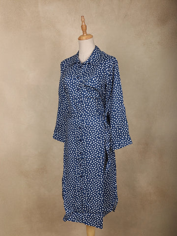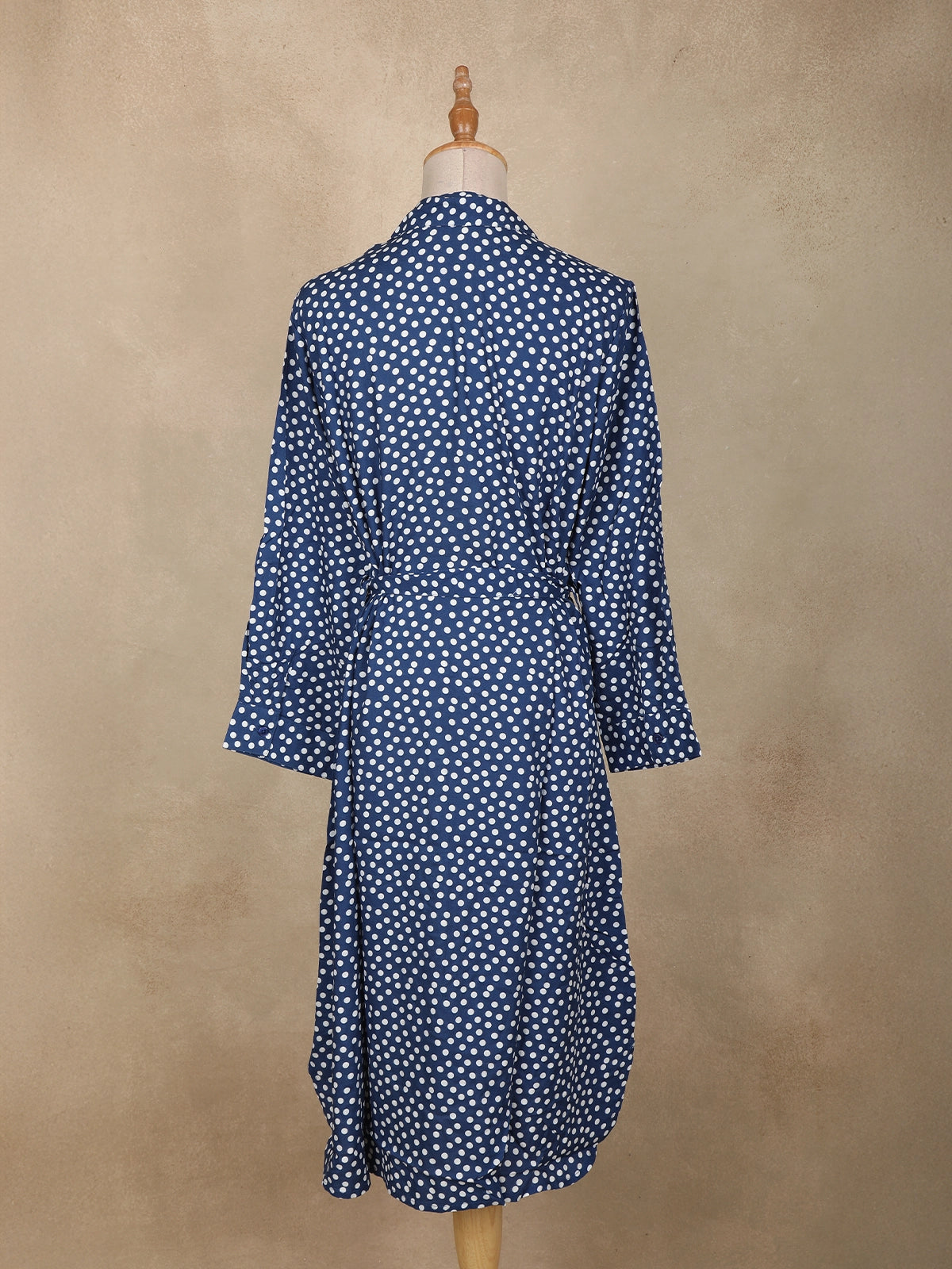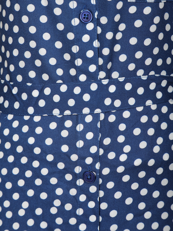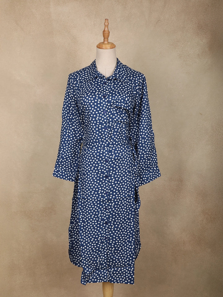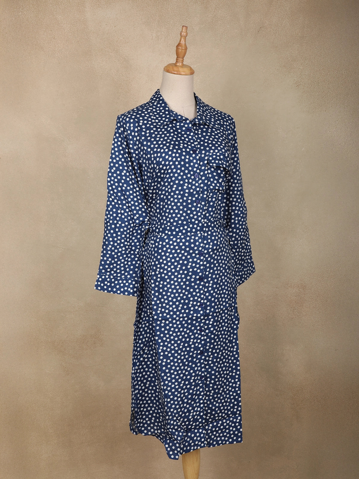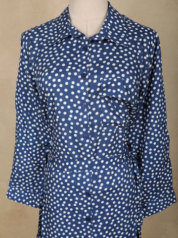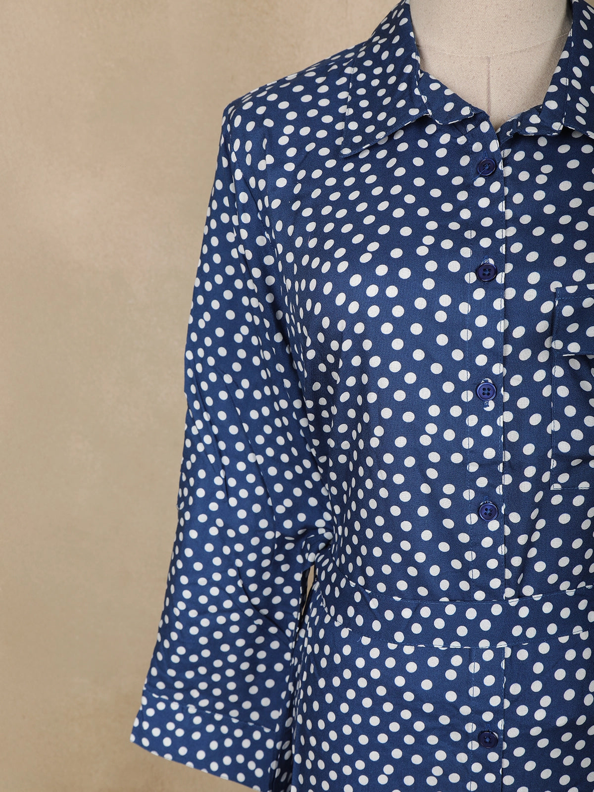 Bring a playful yet classic touch to your everyday style with this Navy Blue Polka Dot Cotton Kurti Top. Made from breathable cotton fabric, it ensures a comfortable and fresh feel throughout the day. The charming white polka dots add a retro-inspired elegance while the shirt collar and button detailing enhance the smart, semi-formal look.