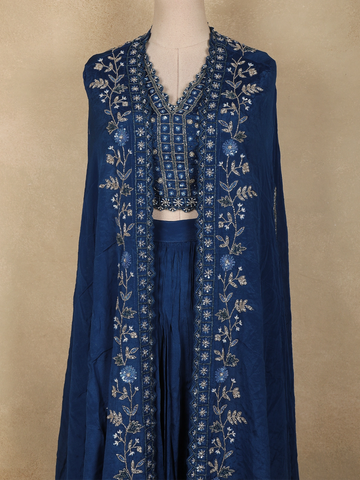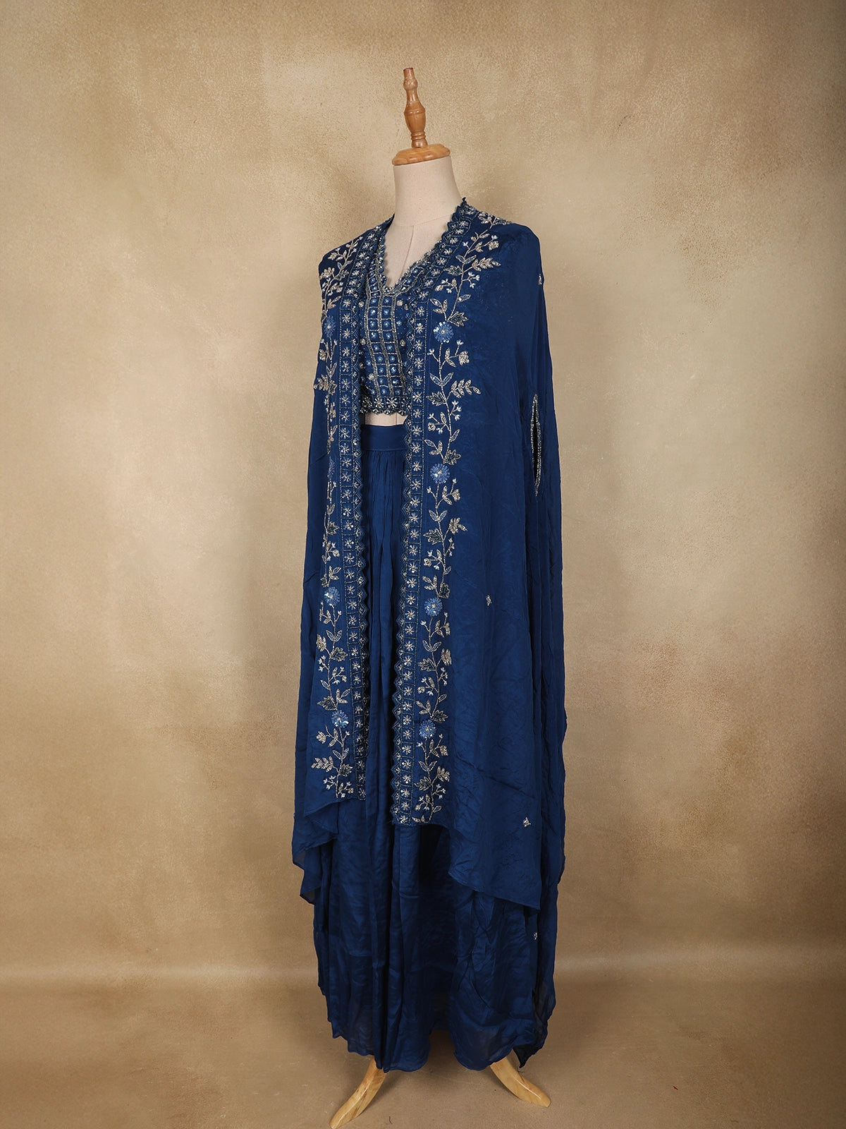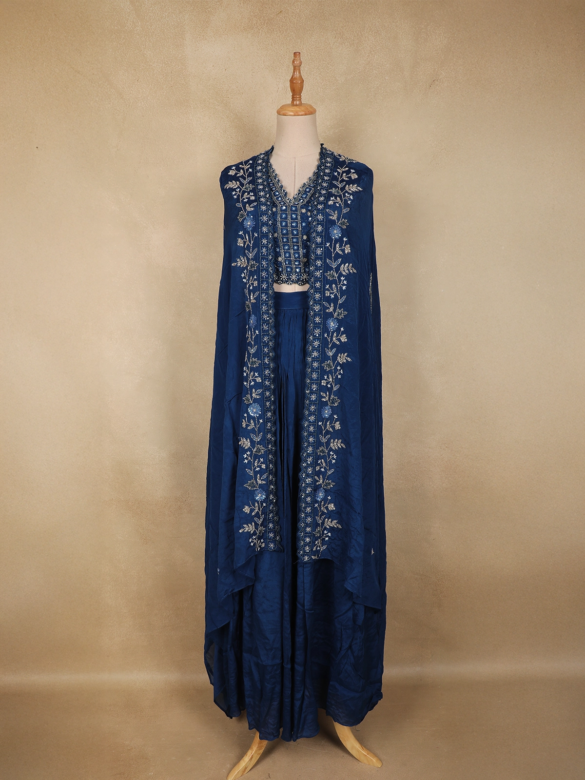 Elevate your festive wardrobe with this navy blue Indo-Western skirt top set, a graceful fusion of contemporary elegance and traditional artistry. Crafted in soft, flowy georgette, the ensemble features a richly embellished crop top paired with a full-length skirt and a coordinated draped overlay that adds fluid movement and refined drama.