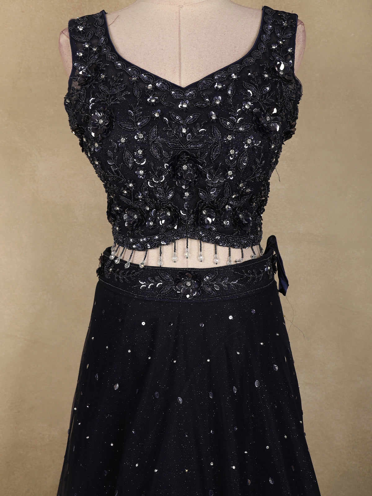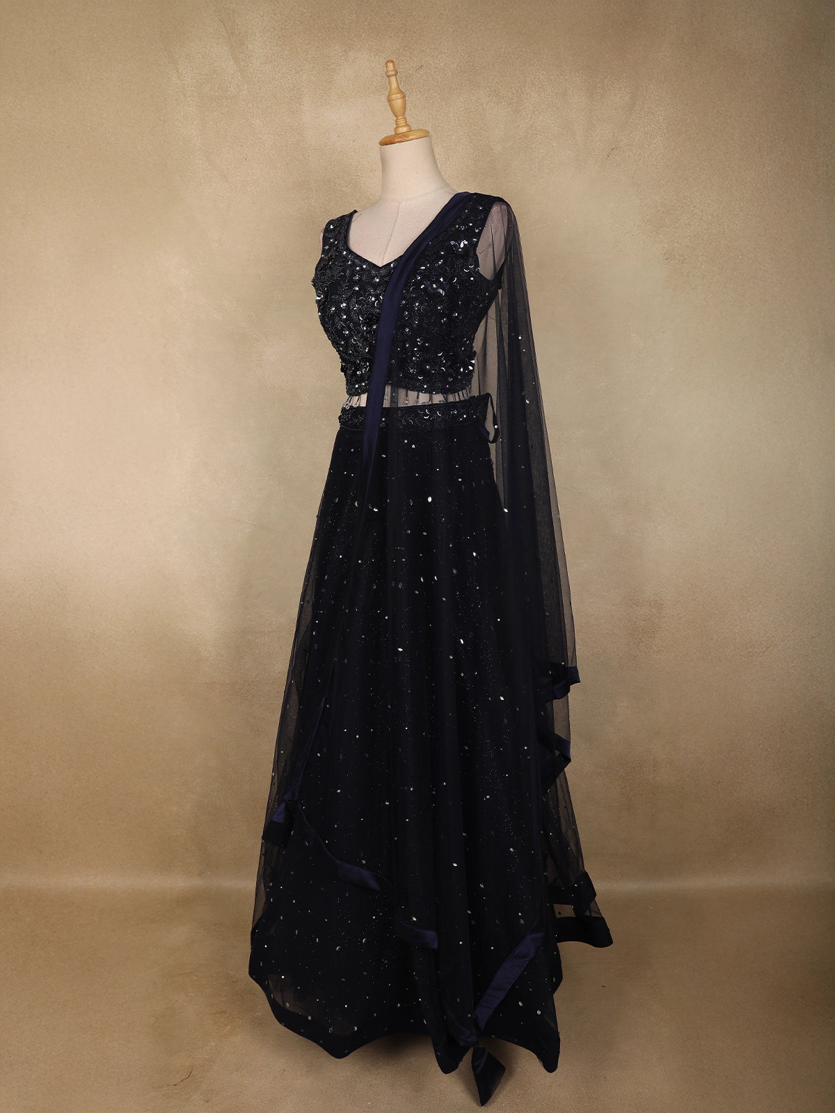 Navy Blue Sequins and Beads Embroidered Design Net Lehenga With Net Dupatta