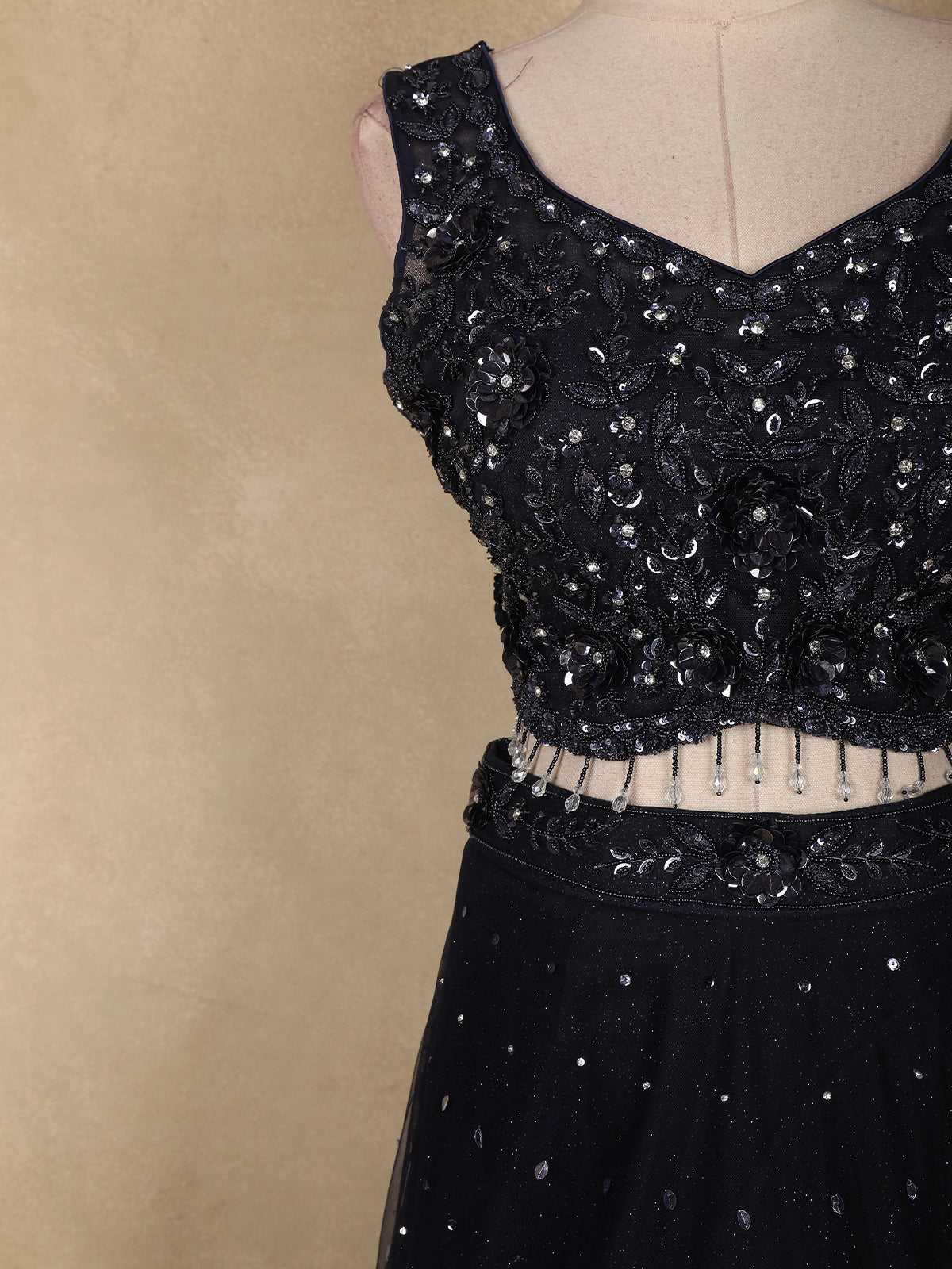 The blouse is beautifully adorned with intricate floral embroidery, highlighted with shimmering sequins and bead embellishments that create a rich, textured finish. Delicate bead tassel detailing along the blouse hem adds a graceful movement and enhances the festive charm. The lehenga skirt is crafted in soft net fabric, embellished with subtle scattered sequins that catch the light effortlessly, giving the outfit a dreamy, ethereal appeal. Its flowing silhouette ensures a flattering drape while allowing ease of movement.