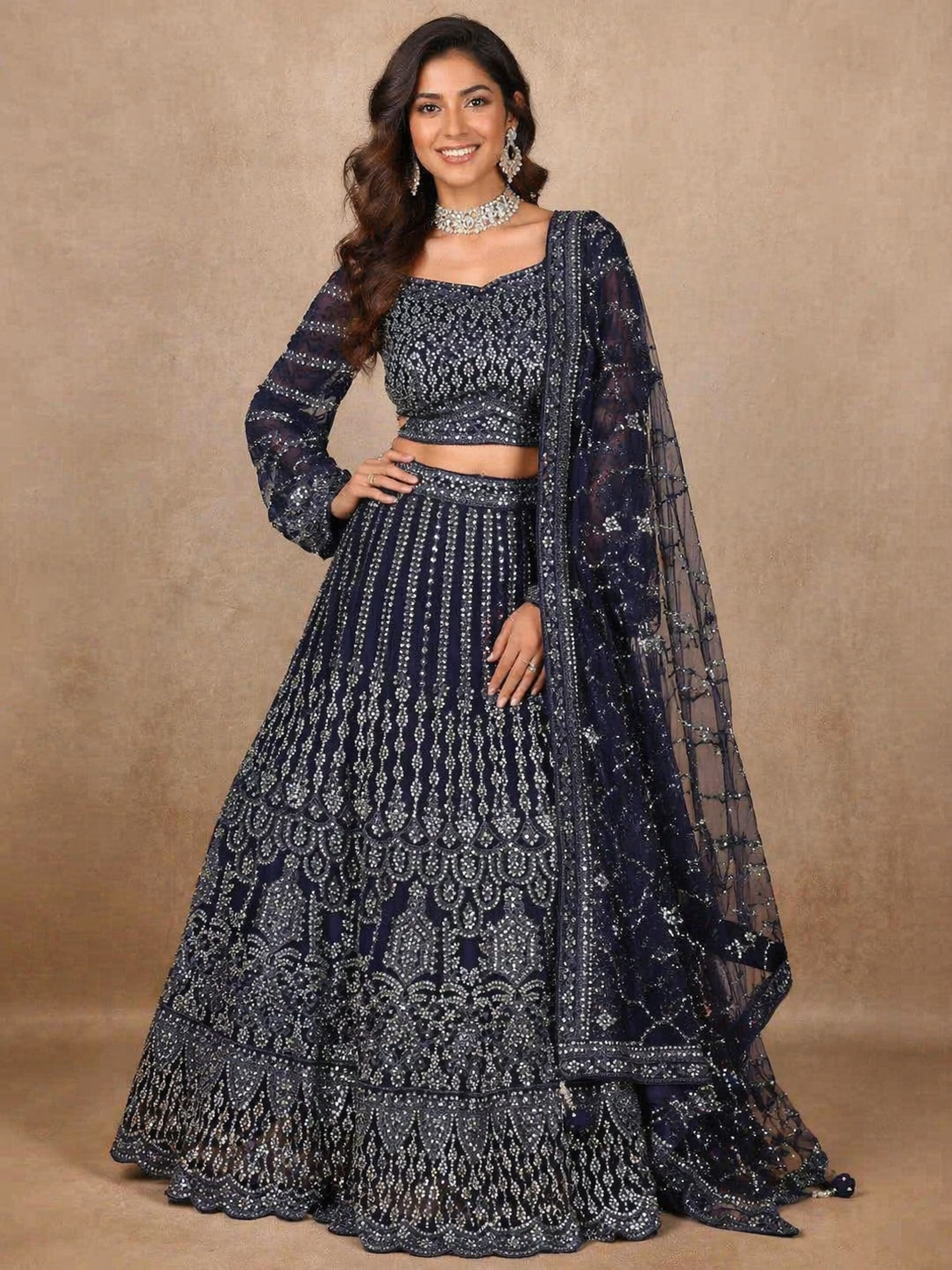 Navy Blue Lehenga Choli for Women is designed to offer a bold and elegant ethnic look for special occasions. This rich embroidered lehenga set features intricate thread and sequin work throughout, making it a refined designer lehenga for women ideal for weddings and festive celebrations. The blouse is tailored with a structured fit, square neckline, and full sleeves, enhancing the overall silhouette with detailed craftsmanship.