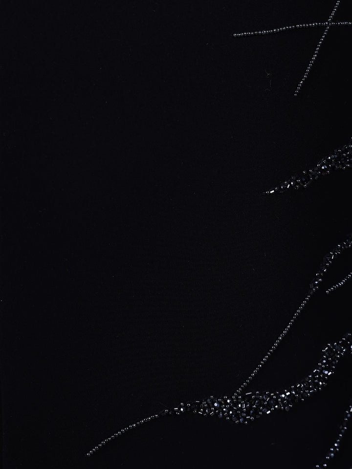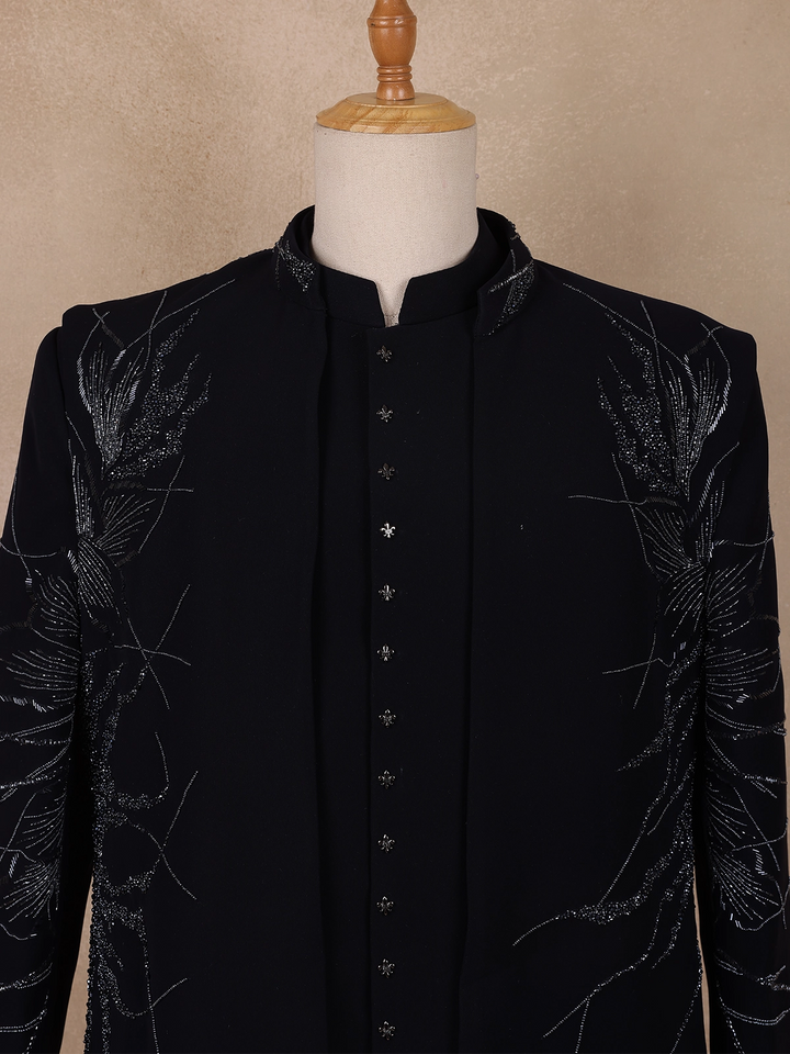 The sherwani is accentuated with silver sequin embroidery arranged in an intricate, abstract branch-inspired pattern across the front, sleeves, and shoulders—creating a dynamic play of shimmer against the deep black base. The mandarin collar and sleek concealed placket lend a contemporary edge, while matching buttons add to its regal charm.