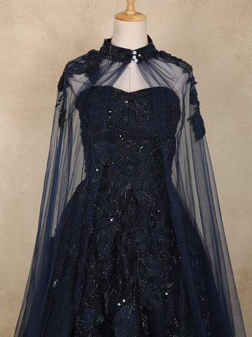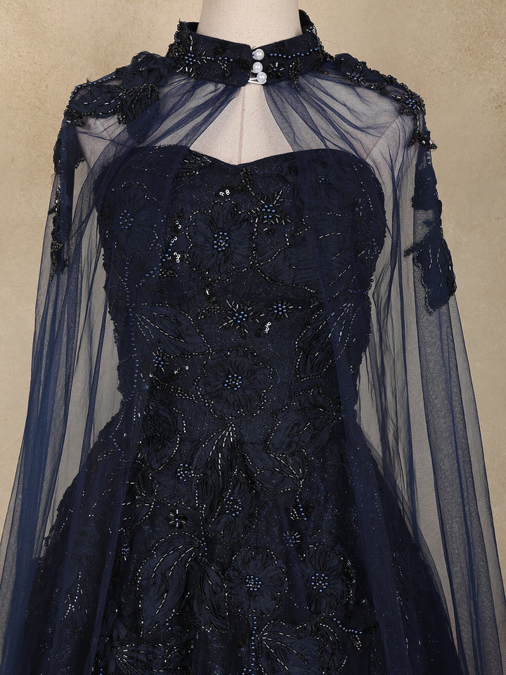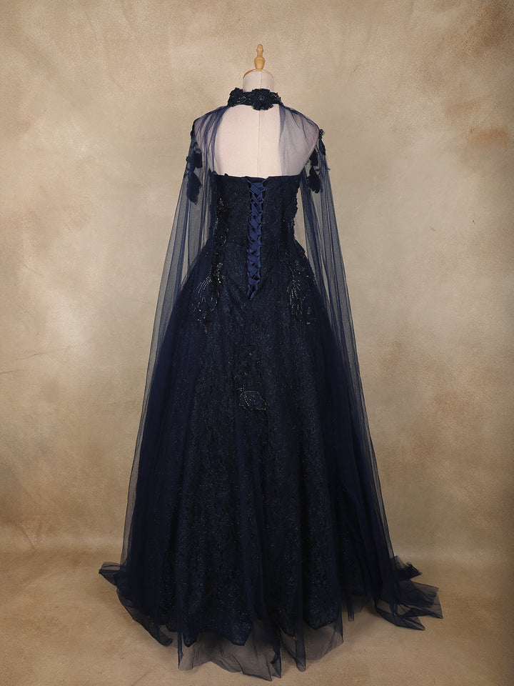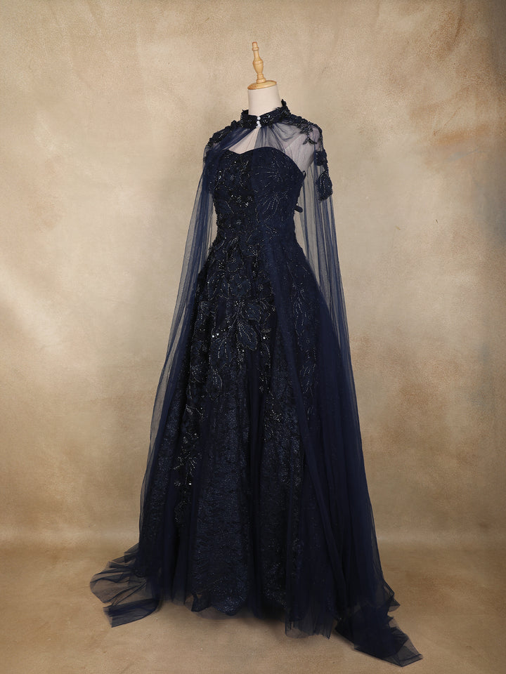 The highlight of this gown is its dramatic sheer net cape sleeves, gracefully flowing from the shoulders to create a majestic, queen-like aura. The wide flared hem enhances the silhouette, giving it a glamorous ballroom look that is perfect for grand occasions.