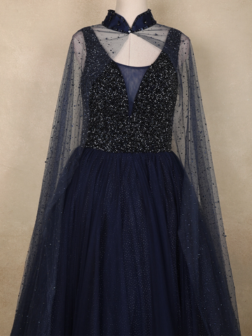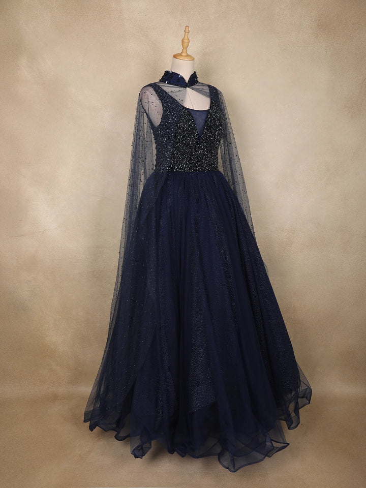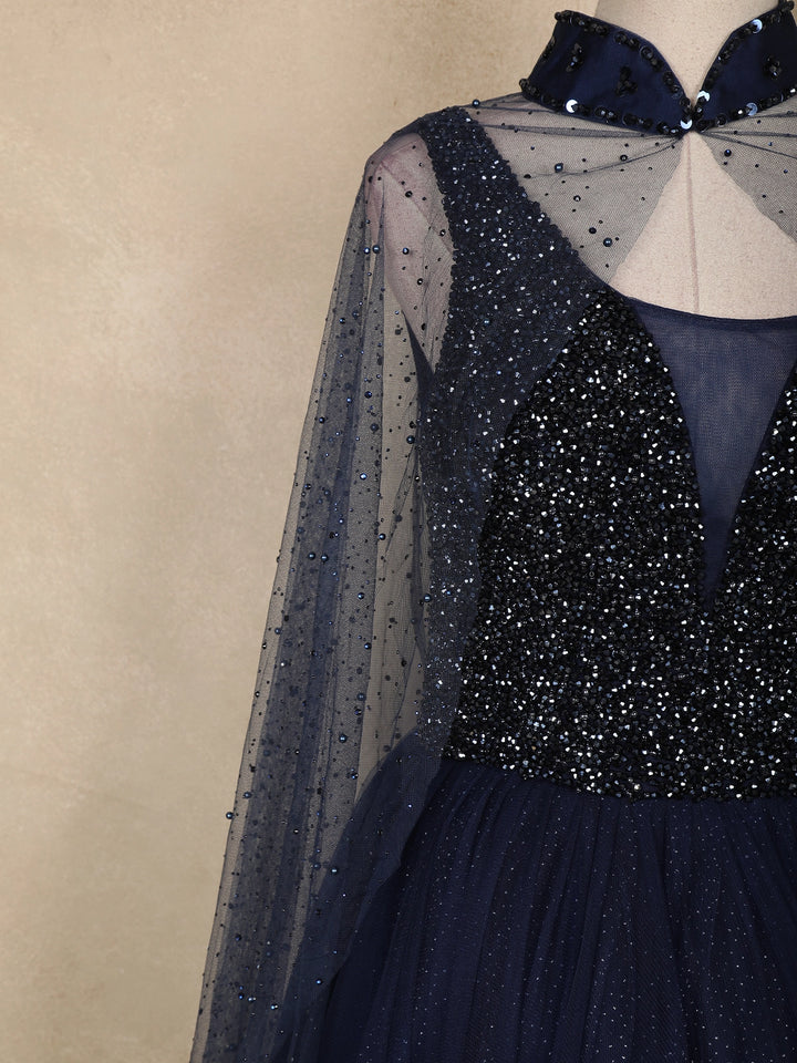 Navy Blue Sequins Embellished Net Gown with Cape Sleeves