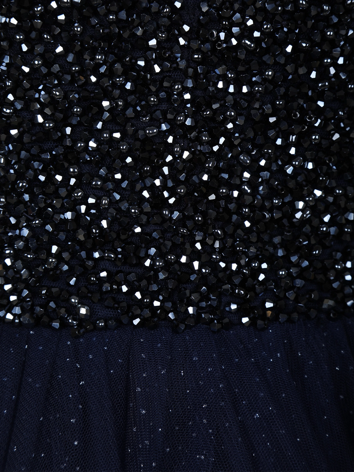 Step into elegance with this breathtaking bavy blue gown, crafted for a fairytale celebration. The fitted bodice dazzles with heavy sequin and bead embroidery in tonal navy blue, creating a radiant shimmer that's perfect for spotlight moments. A deep illusion V-neckline is softened by a sheer net yoke, adding sophistication and modesty to the plunging cut.