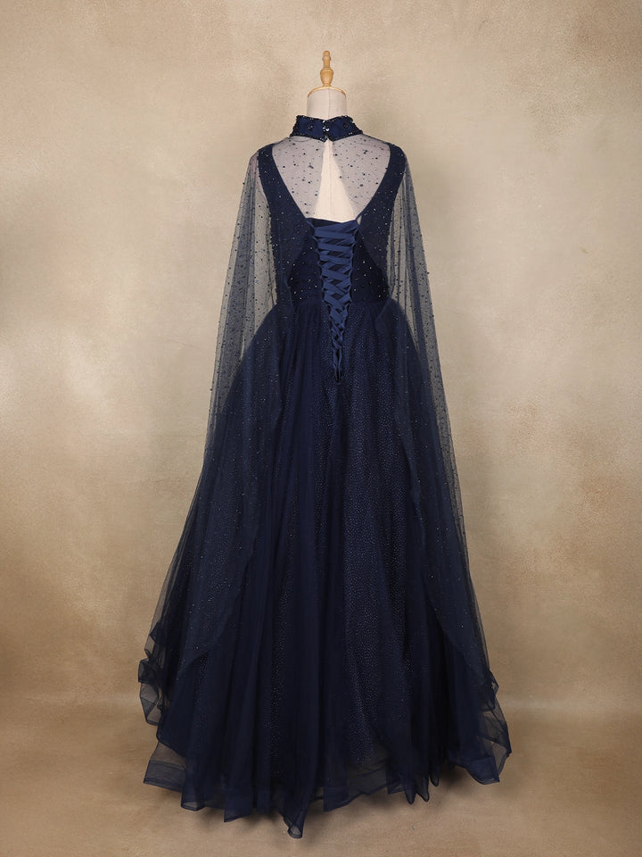 Making a statement are the cape-style net sleeves, richly adorned with scattered sequins and pearls that cascade down gracefully to wrist-length, creating an ethereal drape effect. The back of the gown features a lace-up corset design, ensuring both elegance and a flattering, adjustable fit.