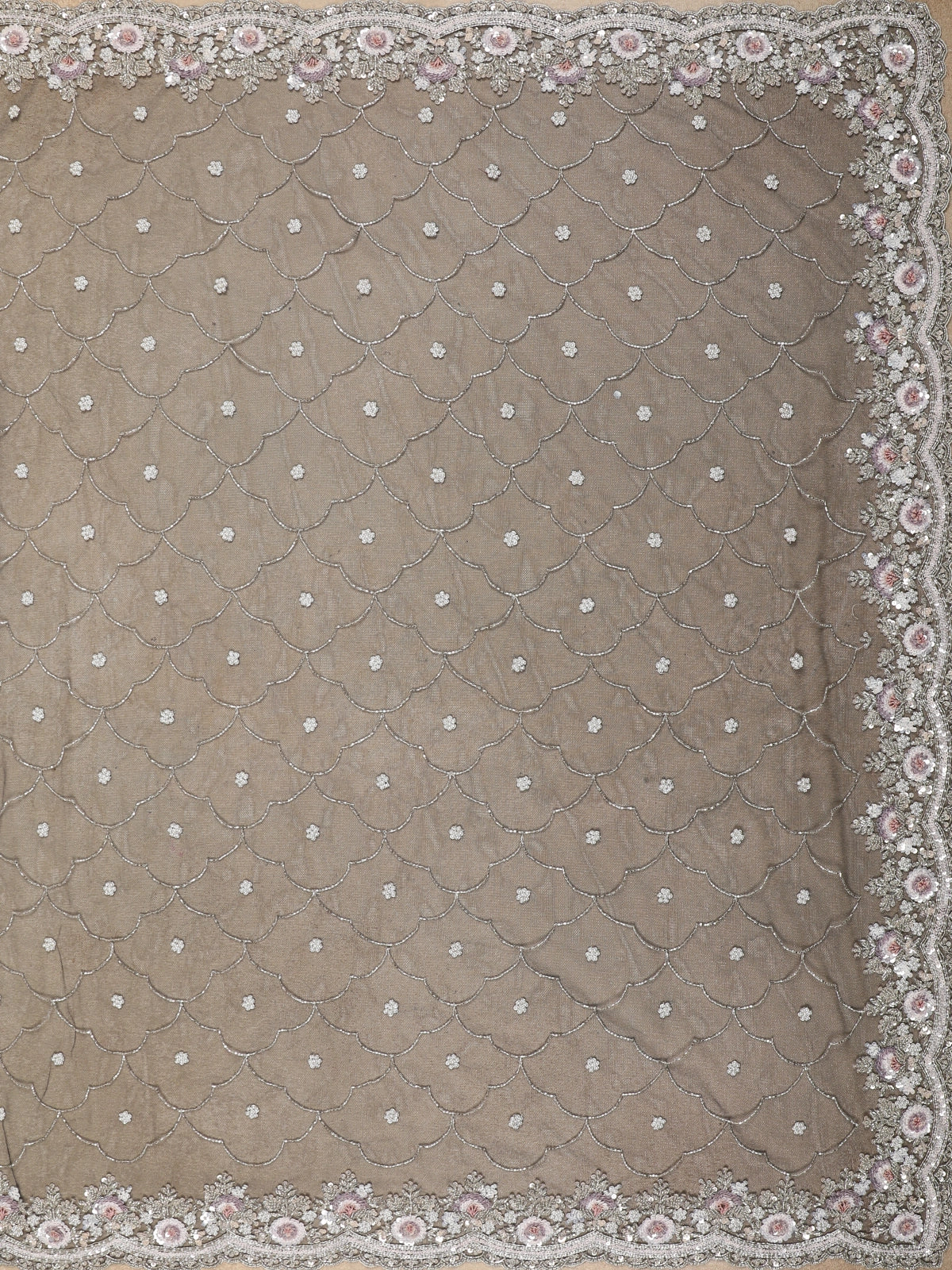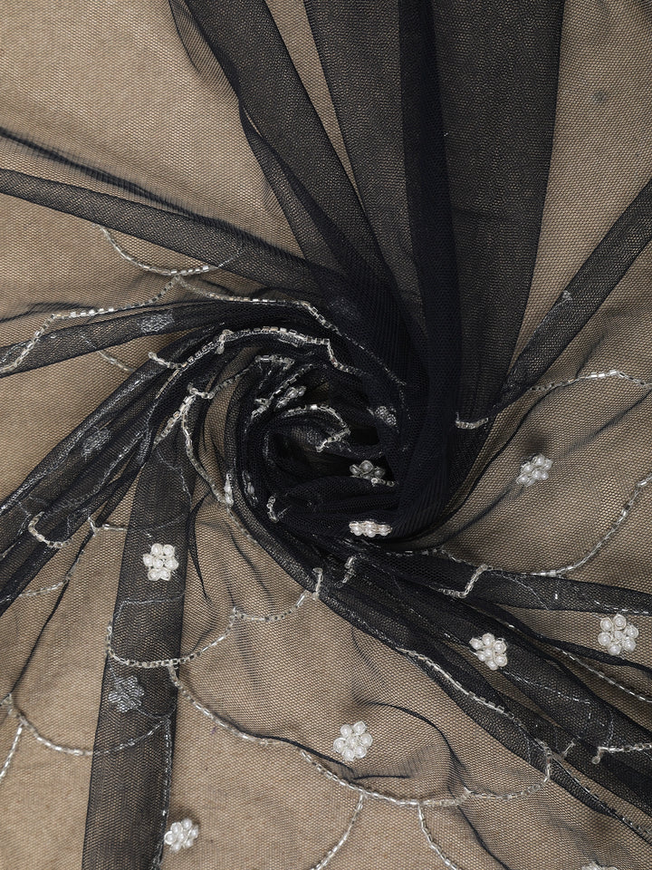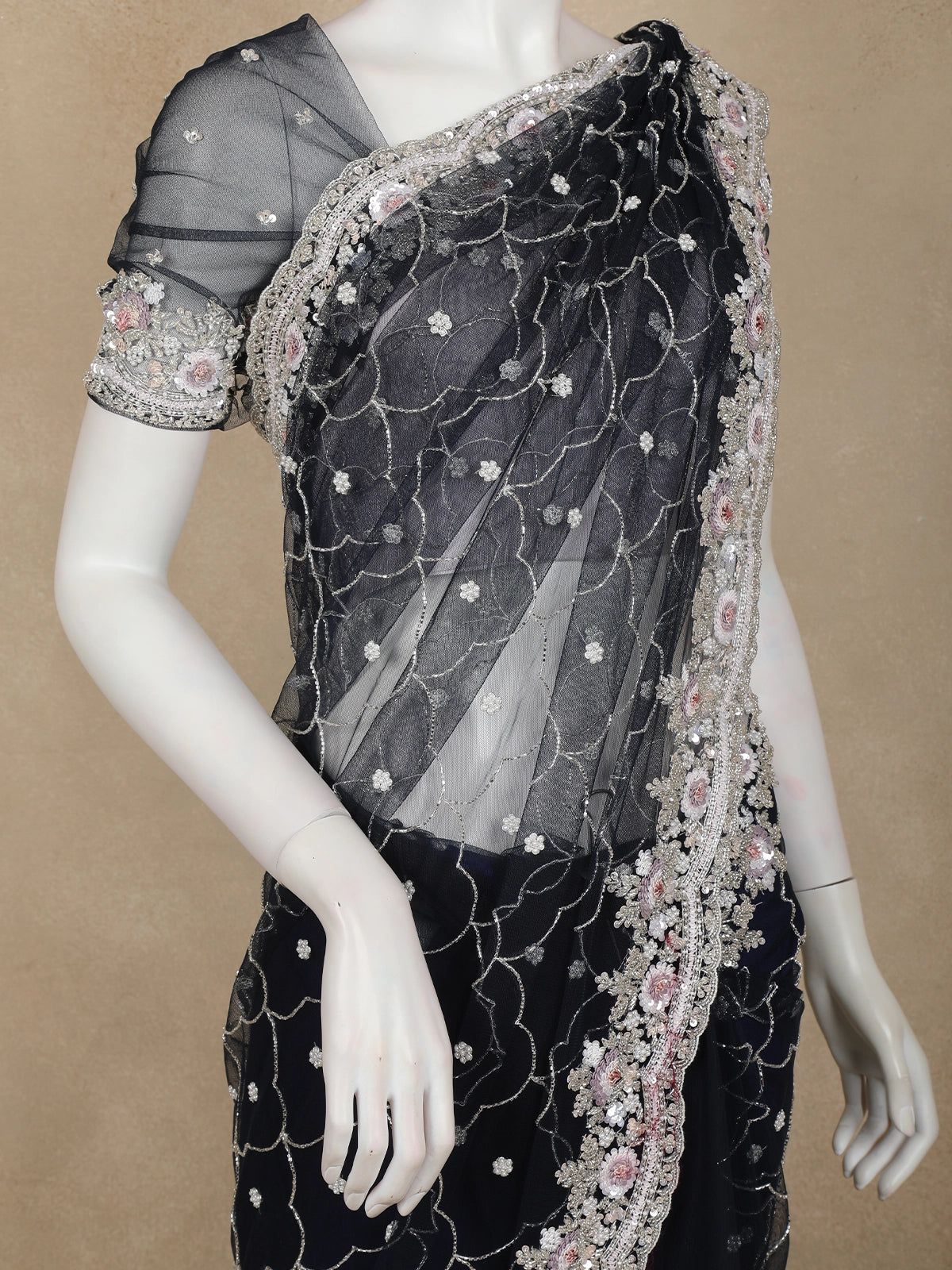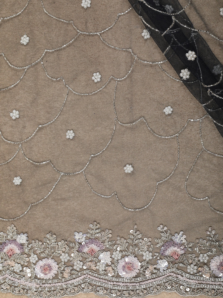 Elevate your celebration style with this stunning Navy Blue Net Saree crafted for glamorous evenings and wedding festivities. The saree features an all-over sequin embroidery arranged in scalloped wave patterns, subtly adding a beautiful shimmer at every step. The highlight is its exquisitely detailed cutwork border adorned with silver threadwork and soft pink floral motifs that lend a romantic charm to the overall look.