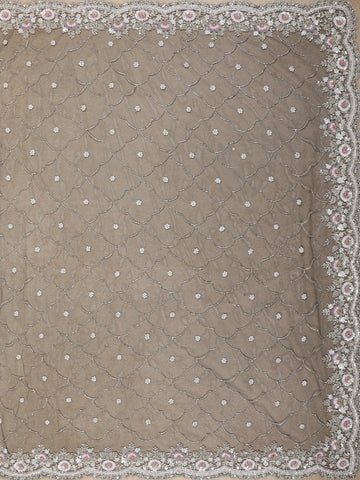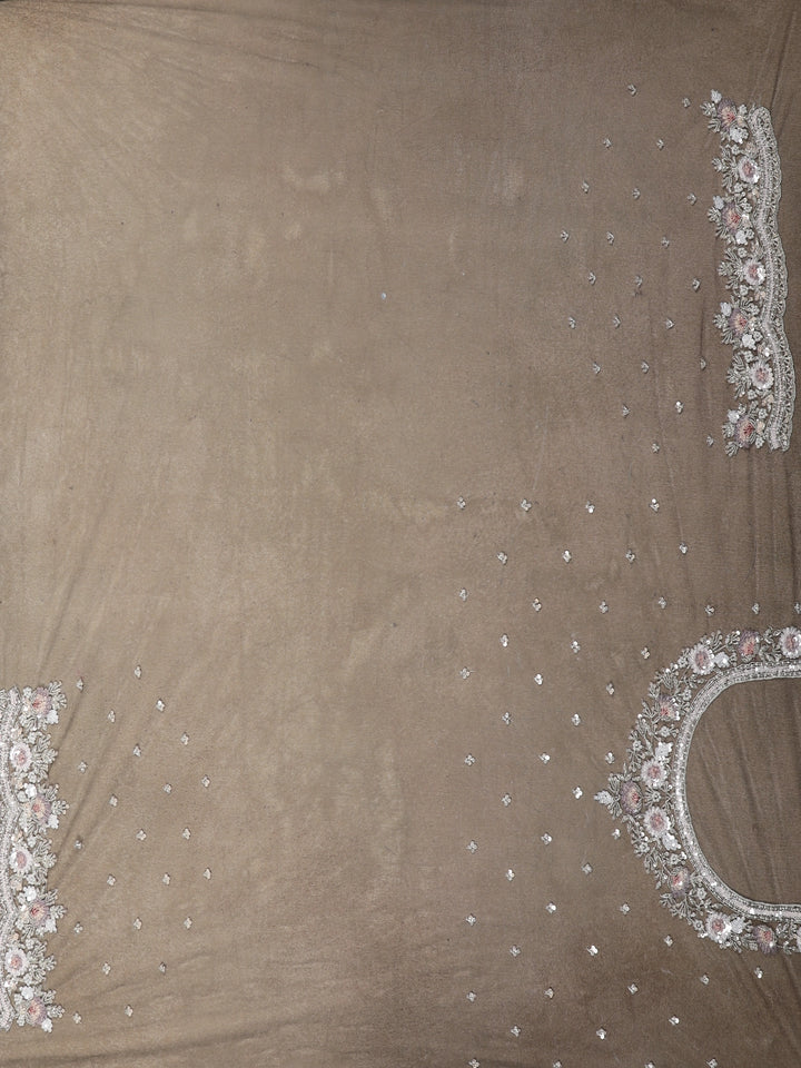 Paired with a matching embroidered blouse featuring a stylish illusion neckline and delicate bead embellishments, this saree promises a graceful and sophisticated silhouette—perfect for receptions, cocktail parties, and sangeet nights.