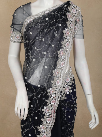 Navy Blue Sequins Embroidered Net Saree with Designer Cutwork Border