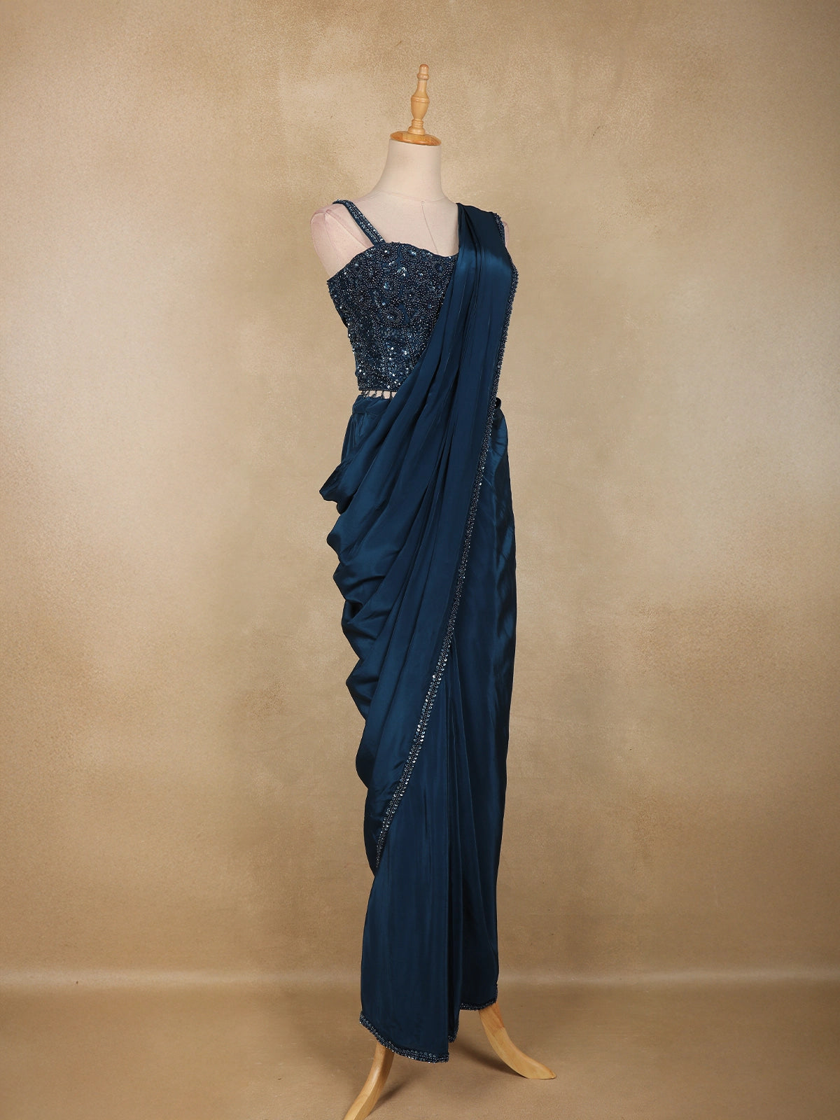 Exude effortless elegance with this navy blue ready-to-wear saree, crafted in lustrous satin for a rich and fluid drape. Designed for modern women who appreciate both style and comfort, this pre-stitched saree offers a flawless silhouette with minimal effort.