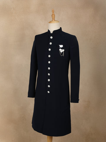 Navy Blue Solid Design Jacquard Indo-Western Sherwani