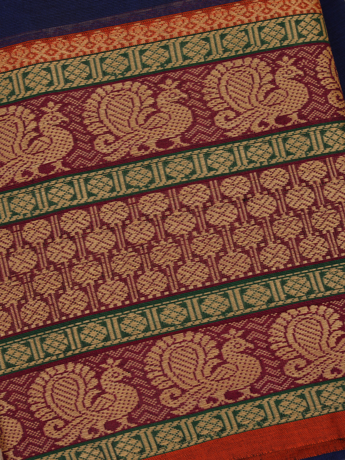 Graceful and timeless, this saree blends traditional artistry with everyday elegance. The saree comes in a deep navy blue base, offering a refined and classic look. The highlight is the rich maroon zari woven border, featuring intricate peacock motifs, symbolizing beauty and celebration. Complimenting this are green geometric zari panels, adding a tasteful and balanced touch of color.