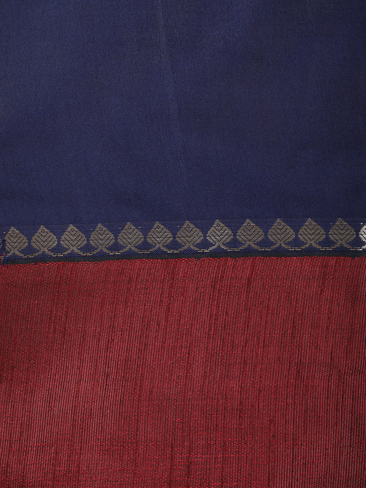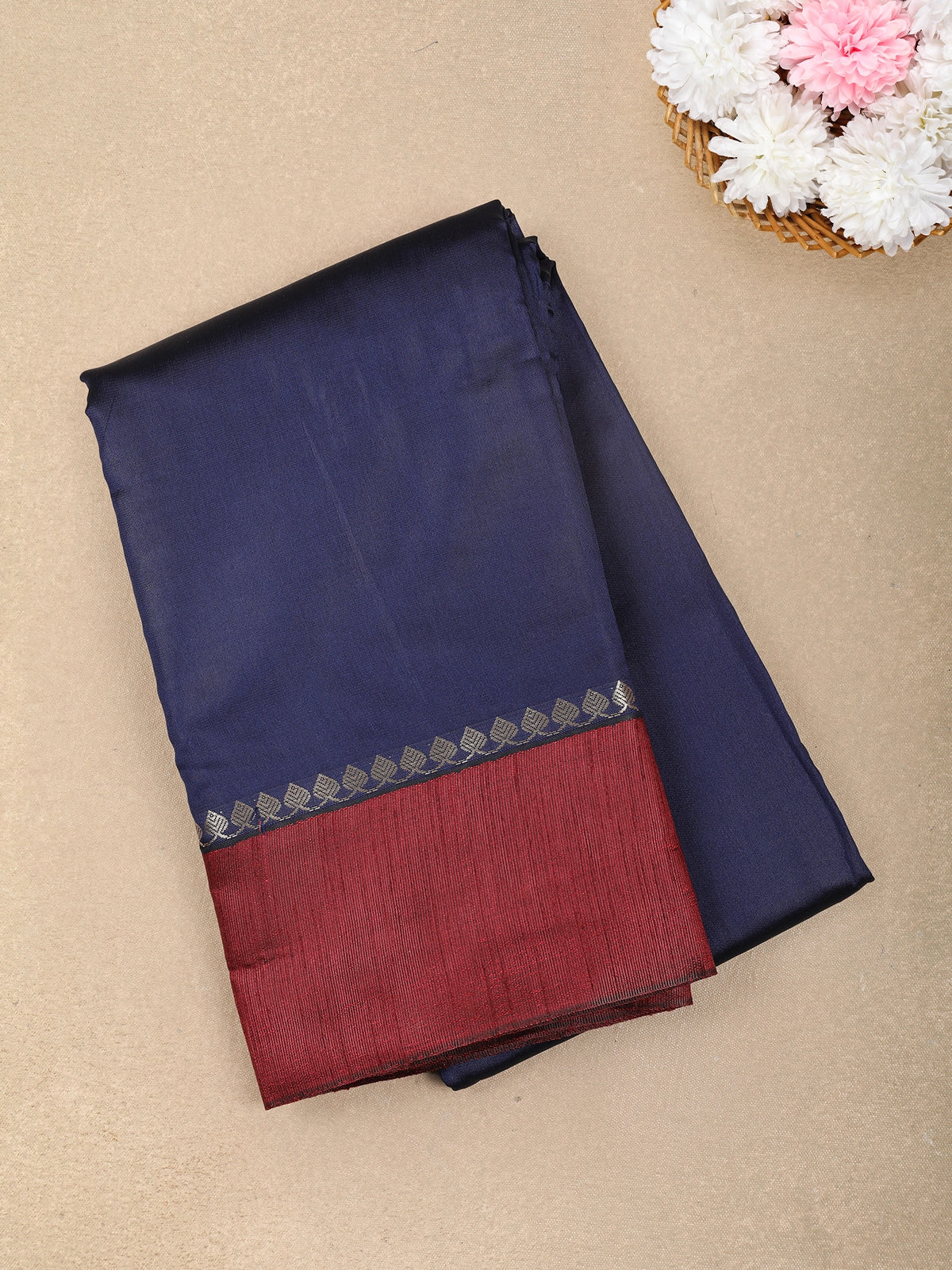 Crafted in a deep royal navy hue, the saree showcases a smooth, lustrous soft silk texture that drapes beautifully and offers a luxurious feel. The solid body highlights the richness of the fabric, making it an ideal choice for those who love understated sophistication with a regal touch.