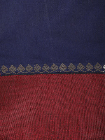 The saree is accentuated with a contrasting maroon border, woven with subtle zari detailing that adds depth and traditional charm. The fine zari work along the border enhances the overall appeal without overpowering the elegant solid base, creating a perfect balance of simplicity and grandeur.