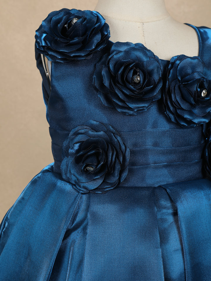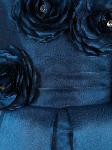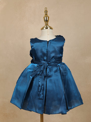 Navy Blue Solid Design with 3D Floral Embellishment Satin Frock