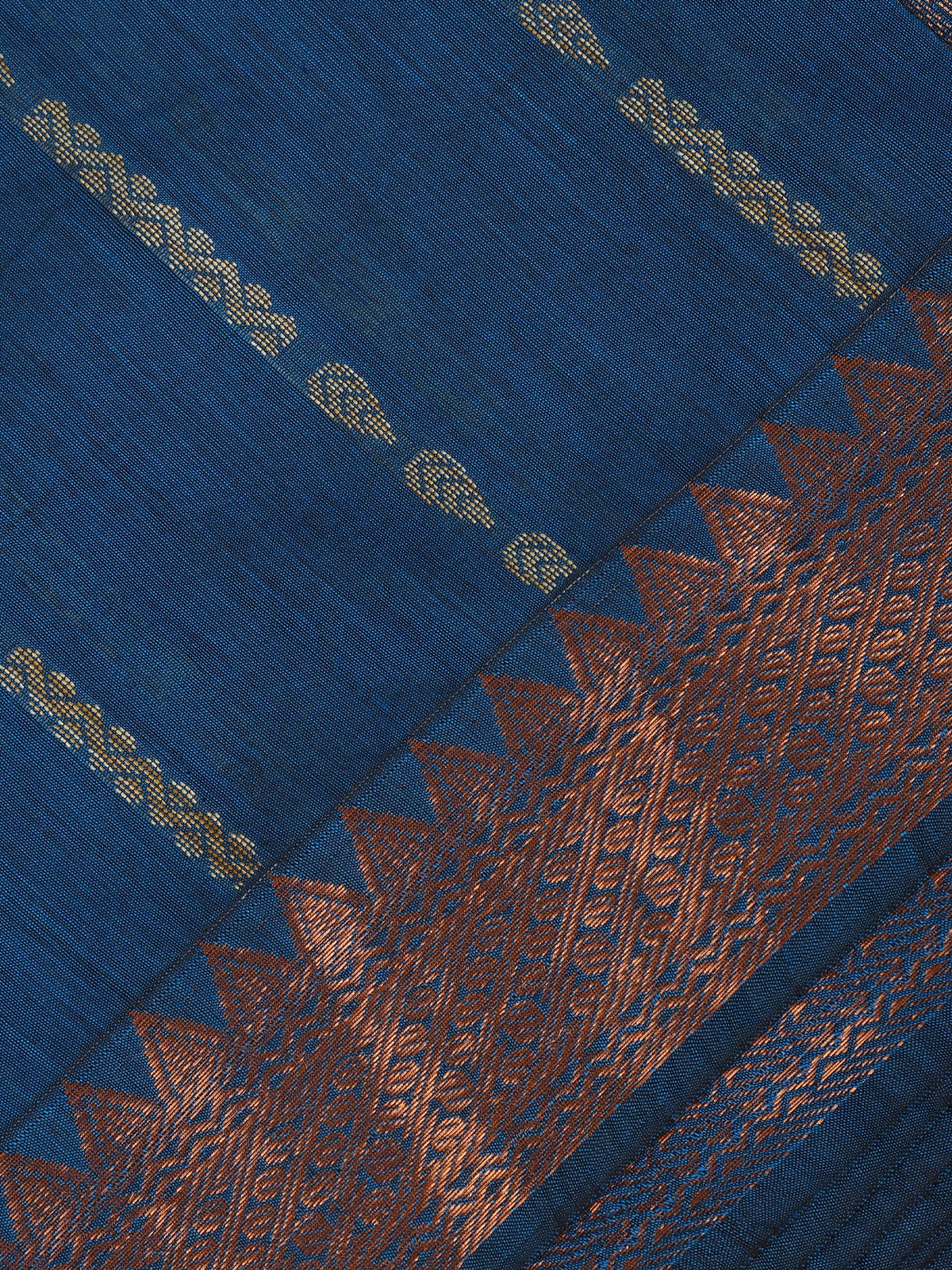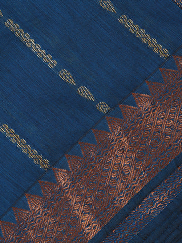 Step into subtle sophistication with this Navy Blue Striped Woven Cotton Saree. The saree features delicate zari-woven stripes across its deep blue canvas, giving it a refined shimmer and texture. Accentuated with a traditional copper-toned zari border, it beautifully balances elegance with everyday versatility. Crafted from breathable cotton, this drape ensures comfort and charm for festive occasions, office wear, or casual gatherings.