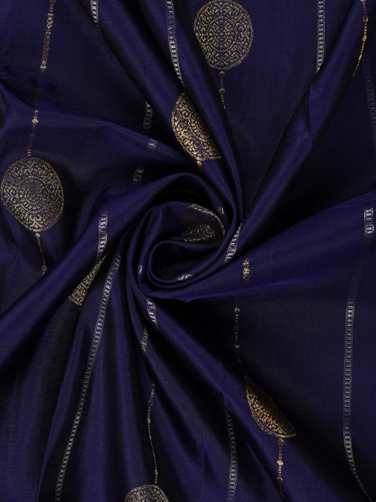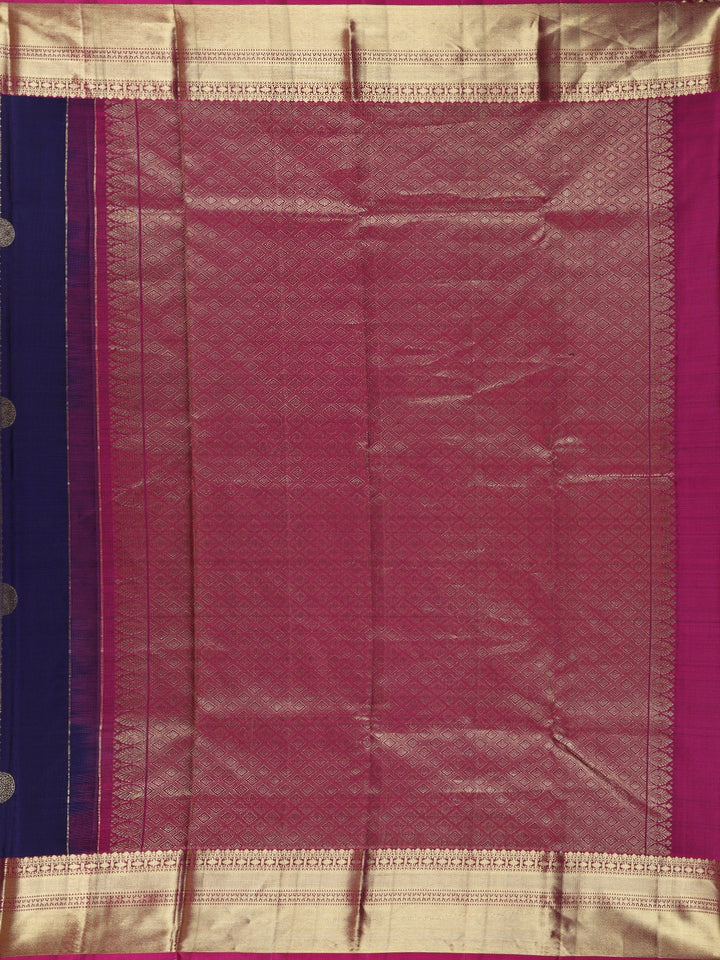 Step into regal charm with this Navy Blue Stripes Butta Woven Kanchipuram Silk Saree, a timeless creation that blends traditional artistry with majestic appeal. The saree features gold zari buttas delicately placed along elegant striped patterns, giving a graceful rhythm to the drape. The broad contrast pink zari border and richly woven pallu add a vibrant touch of opulence, making it perfect for weddings, festive occasions, and grand celebrations.