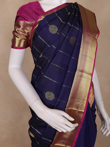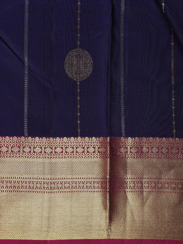Navy Blue Stripes Butta Woven Kanchipuram Silk Saree With Contrast Pink Zari Border