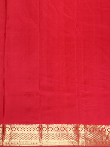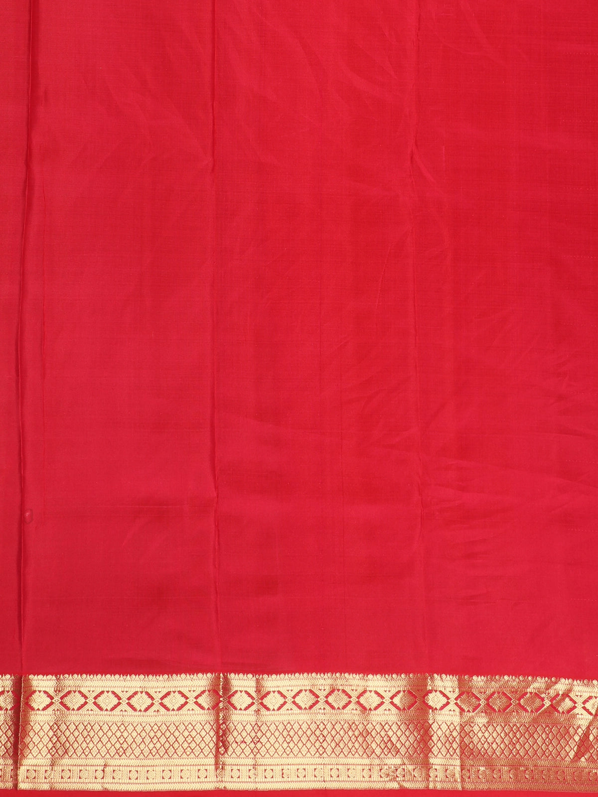 The broad golden zari border adorned with traditional meenakari patterns frames the saree with a regal elegance, making it the perfect choice for weddings, temple visits, festive ceremonies, and heritage celebrations.