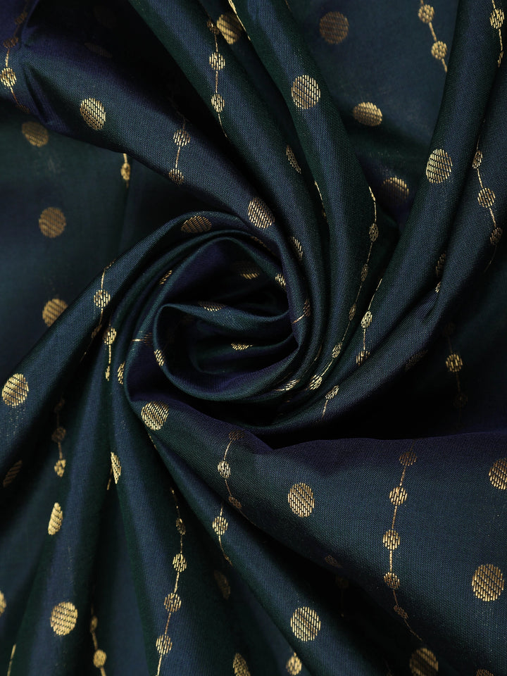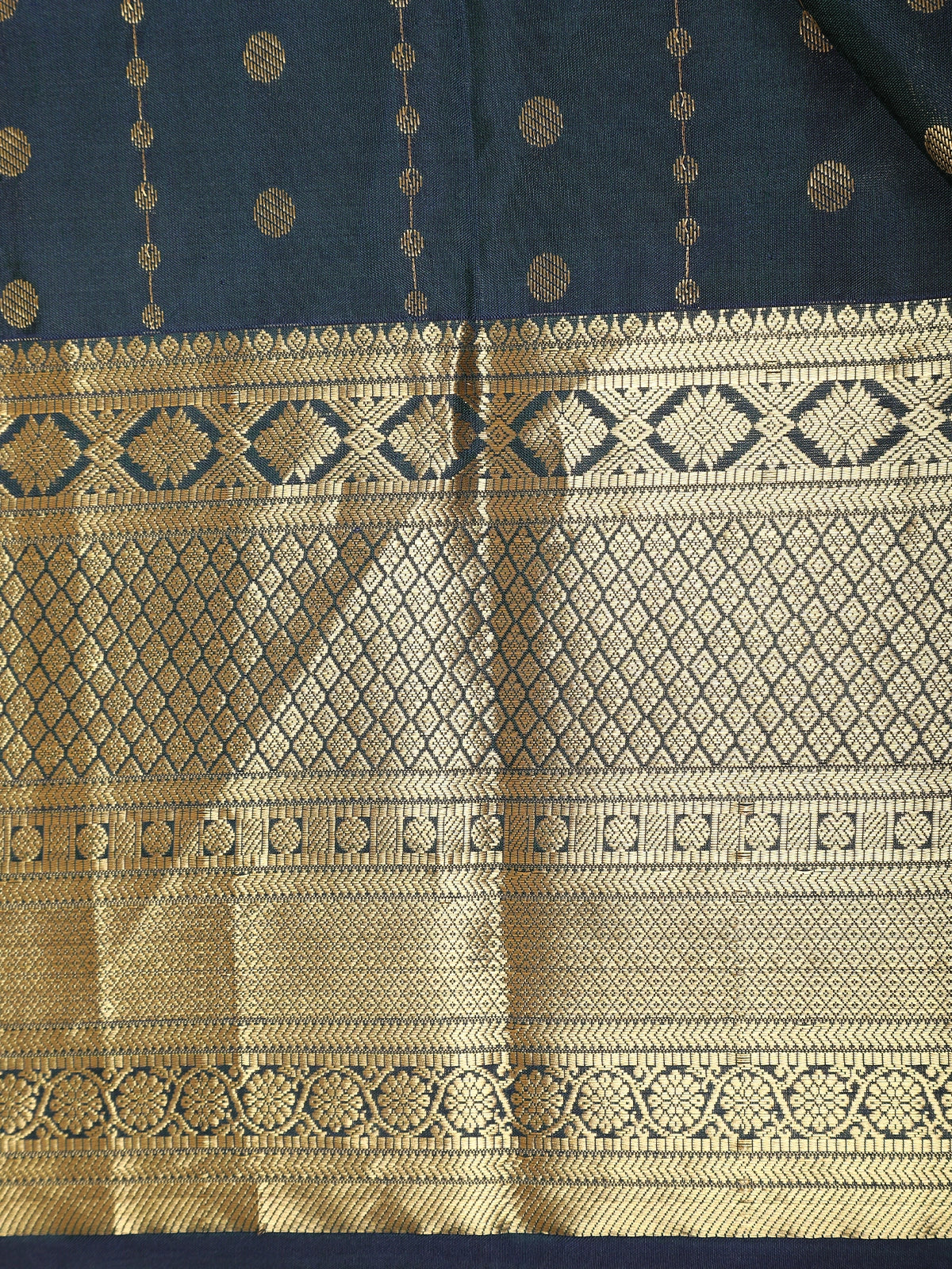 Elevate your traditional charm with this exquisite Pure Kanchipuram Silk Saree, beautifully handwoven in a deep navy blue base. The body features elegant golden polka buttas arranged in a Stripes pattern, lending a graceful vintage appeal. The contrast rani pink pallu adds a vibrant festive touch, enhanced further with intricate golden zari woven motifs that showcase the artistry of South Indian weaving culture.