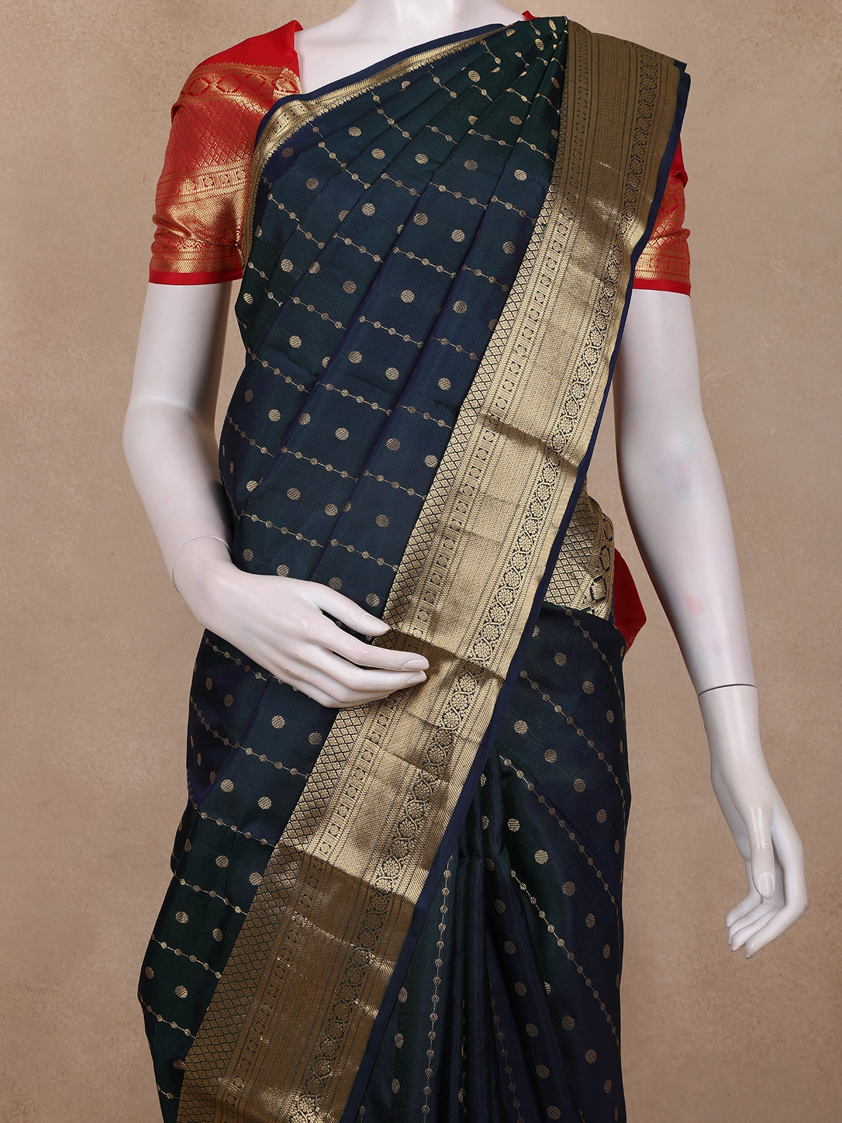 Navy Blue Stripes Butta Woven Kanchipuram Silk Saree with Zari Border