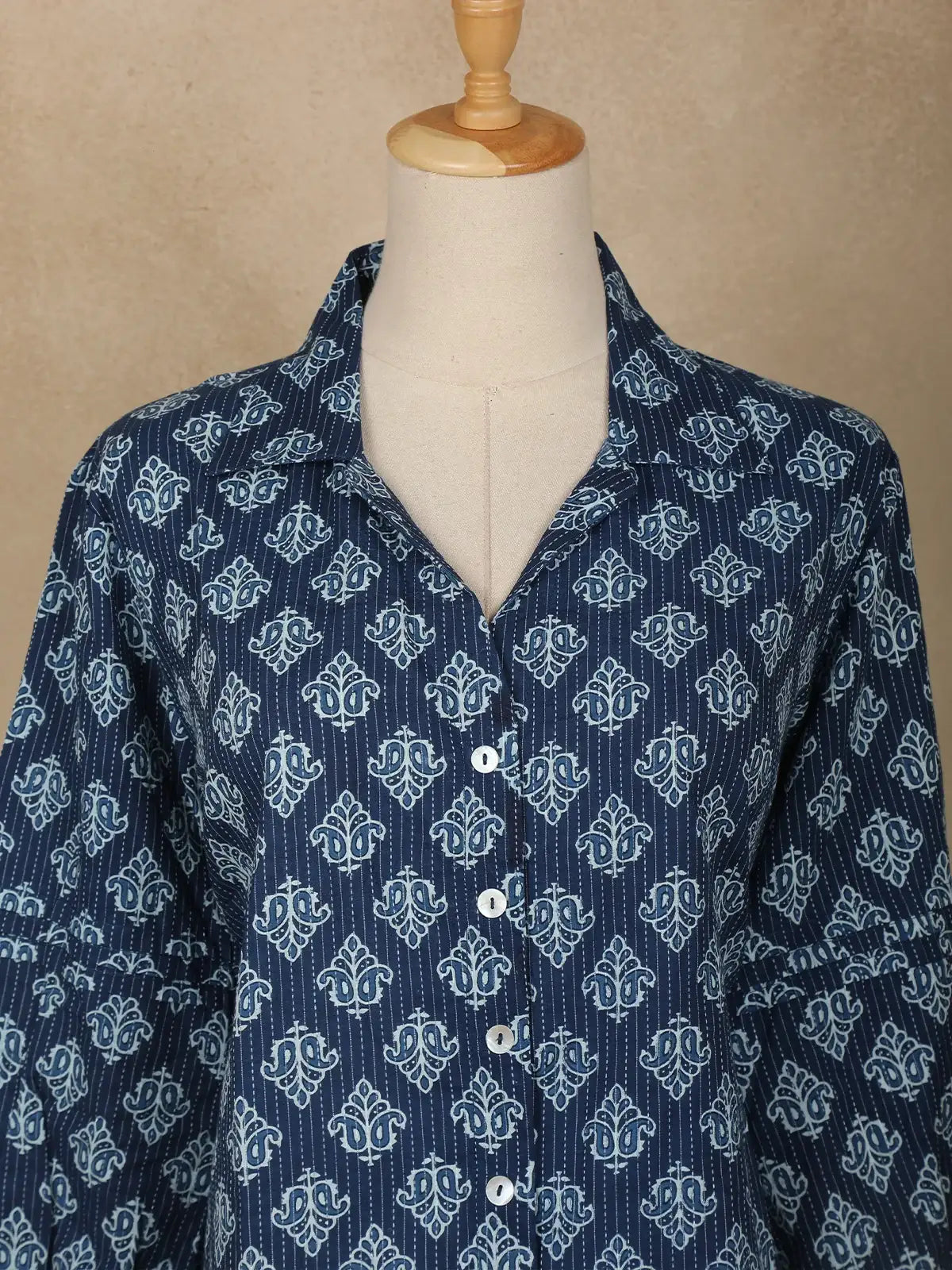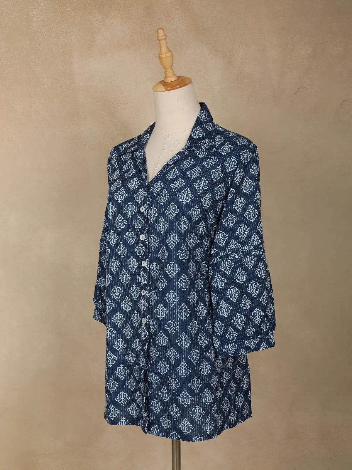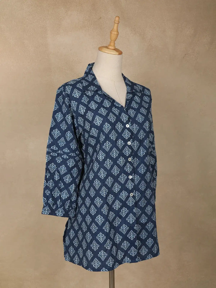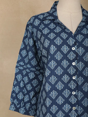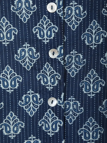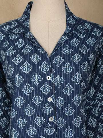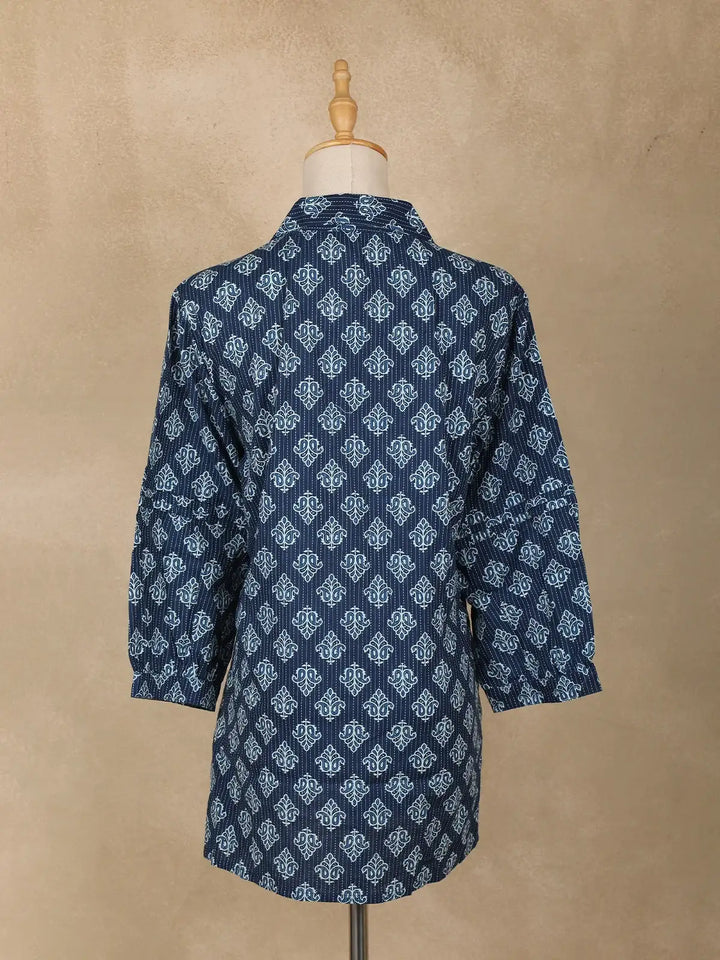 Drape yourself in understated elegance with this Navy Blue Stripes Design Cotton Top, a perfect blend of comfort and chic styling. Crafted from breathable cotton, this top keeps you cool and comfortable while adding a polished touch to your everyday wardrobe. The shawl collar neckline lends a graceful silhouette, complemented by full sleeves that bring a refined charm to the look. Designed with a relaxed fit and subtle striped detailing, it’s versatile enough to style for office meetings, casual outings, or travel wear. Pair it effortlessly with jeans, palazzos, or straight trousers to create looks that are both modern and timeless. An easy-care, all-season essential that ensures style meets functionality.