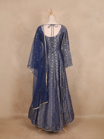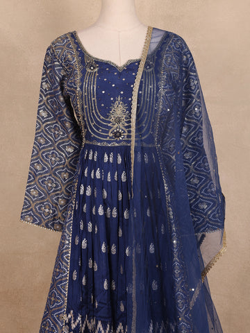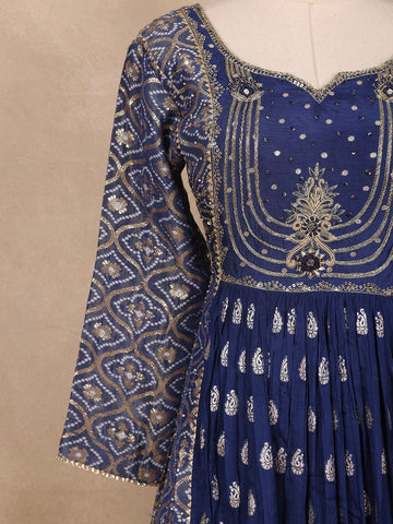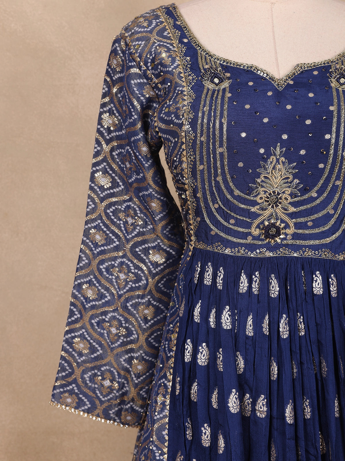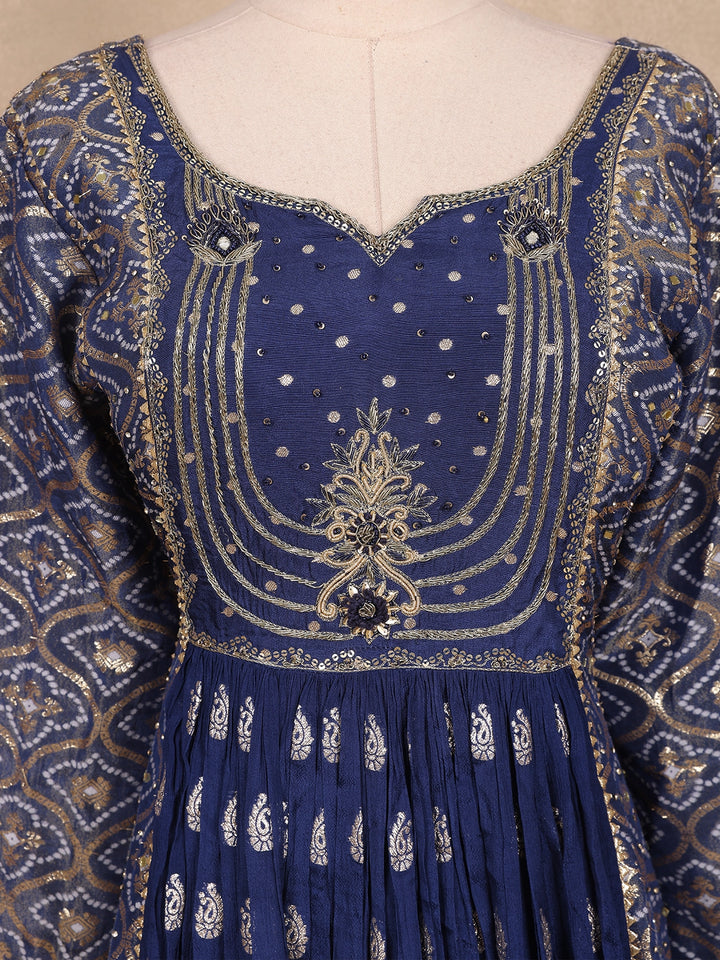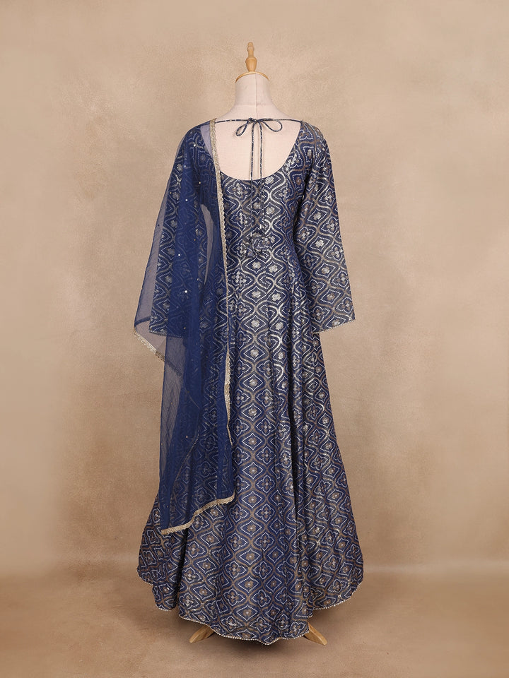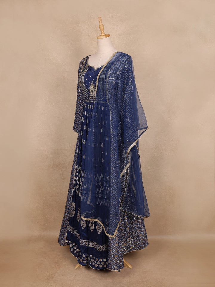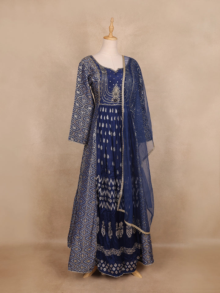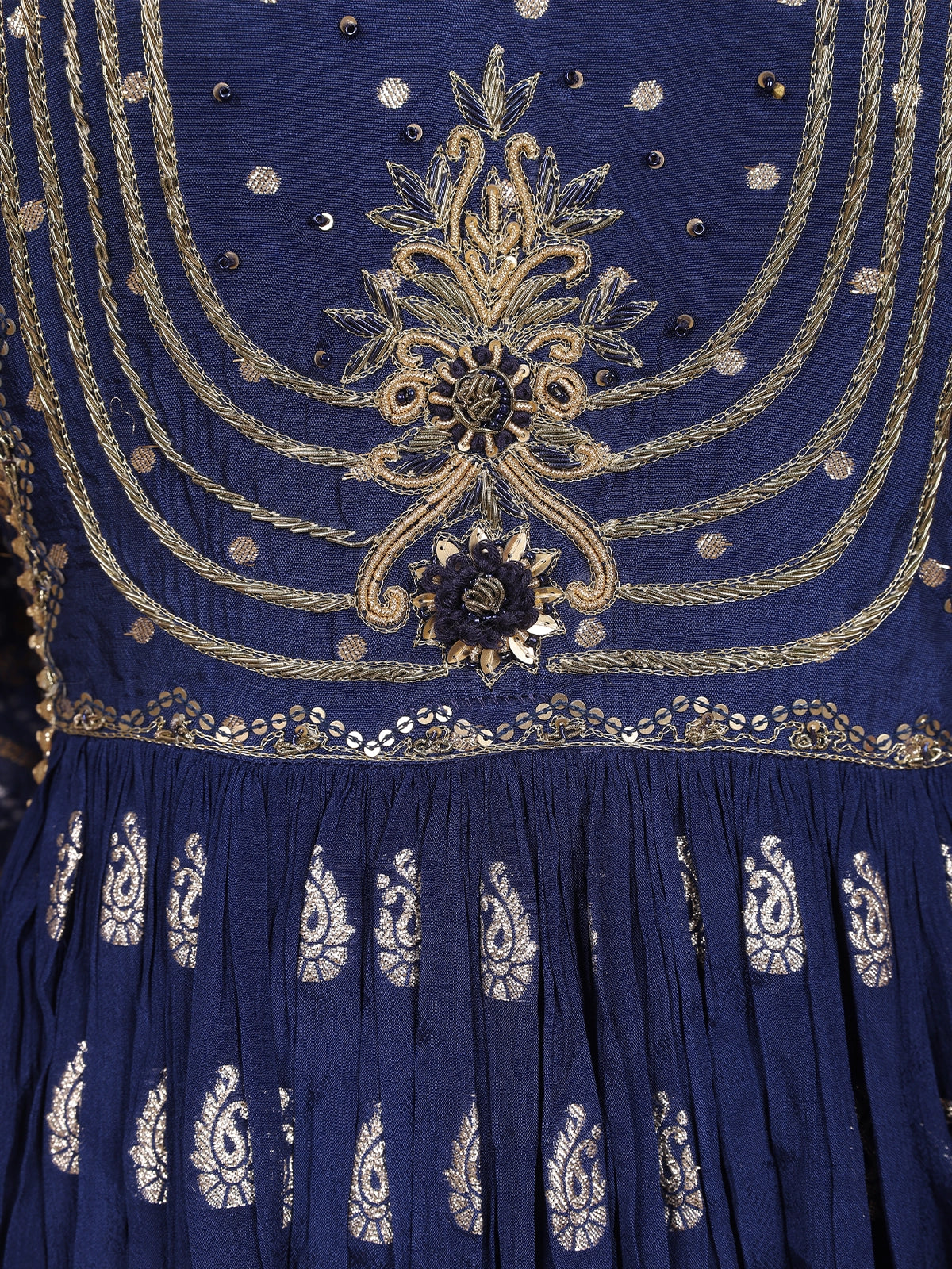 Drape yourself in royal elegance with this Navy Blue Zari Embroidered Gown, a perfect harmony of traditional artistry and timeless allure. The luxurious silk-blend fabric is intricately adorned with shimmering gold zari embroidery and foil motifs, creating an exquisite interplay of texture and sheen.
