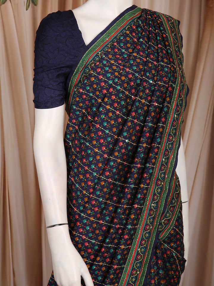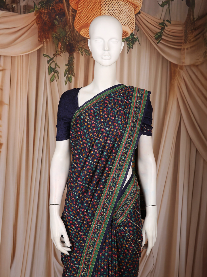 A stylish contrast border in green and intricate printed detailing enhances the overall appeal, adding structure and definition to the saree. The timeless navy blue base beautifully highlights the vibrant floral pattern, making it a versatile pick for different styling moods.