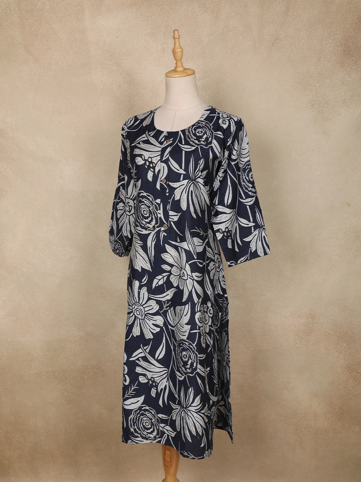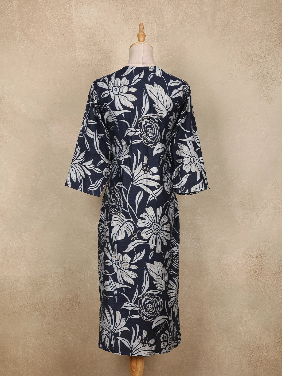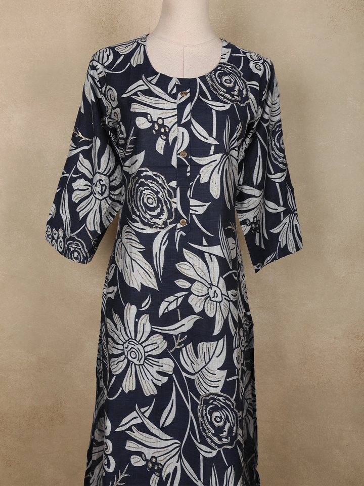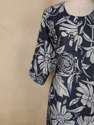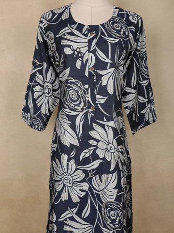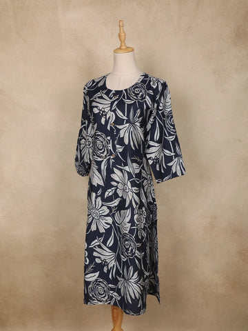 Step into effortless elegance with this Navy Floral Printed Cotton Kurti, designed for comfort, charm, and everyday style. The kurti features a striking white floral print artistically spread across a deep navy base, creating a fresh and modern ethnic look.