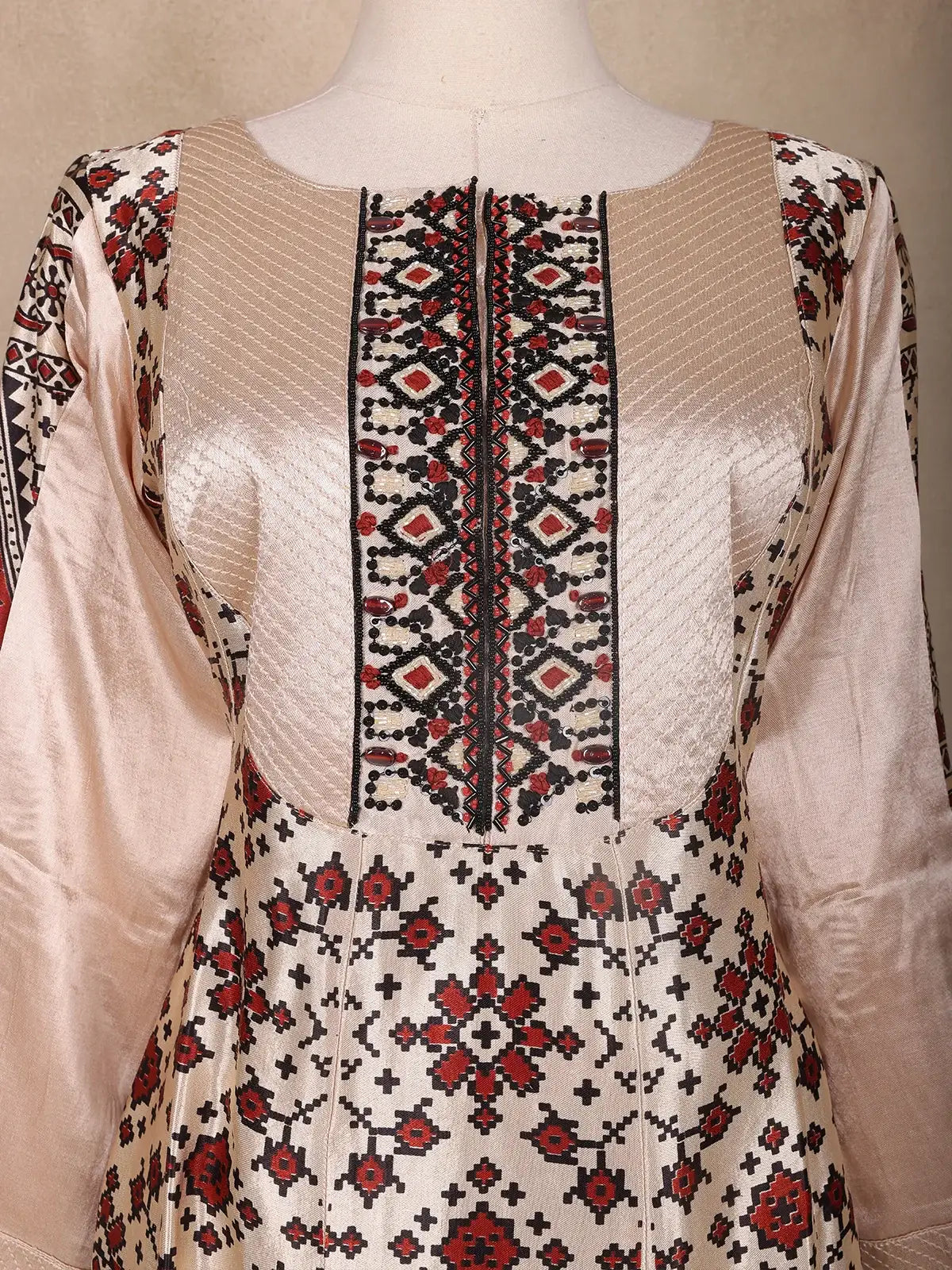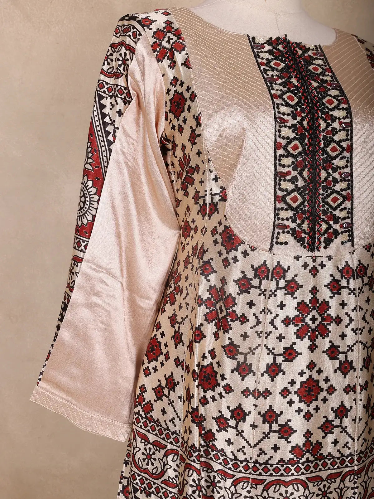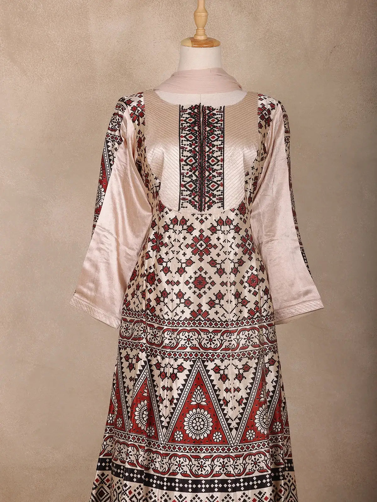 Embrace timeless elegance with this Nude Beige Polished Cotton Palazzo Suit, a perfect blend of sophistication and festive charm. Designed with a striking geometric print pattern in rich hues of maroon, black, and white, the suit exudes contemporary grace while staying true to traditional aesthetics. The full sleeves and straight-cut kurta enhance the structured look, while the soft polished cotton fabric ensures breathable comfort with a subtle sheen. Paired with coordinated palazzo bottoms and a complementing dupatta, this outfit is an ideal pick for festive gatherings, cultural celebrations, or elegant evening occasions.