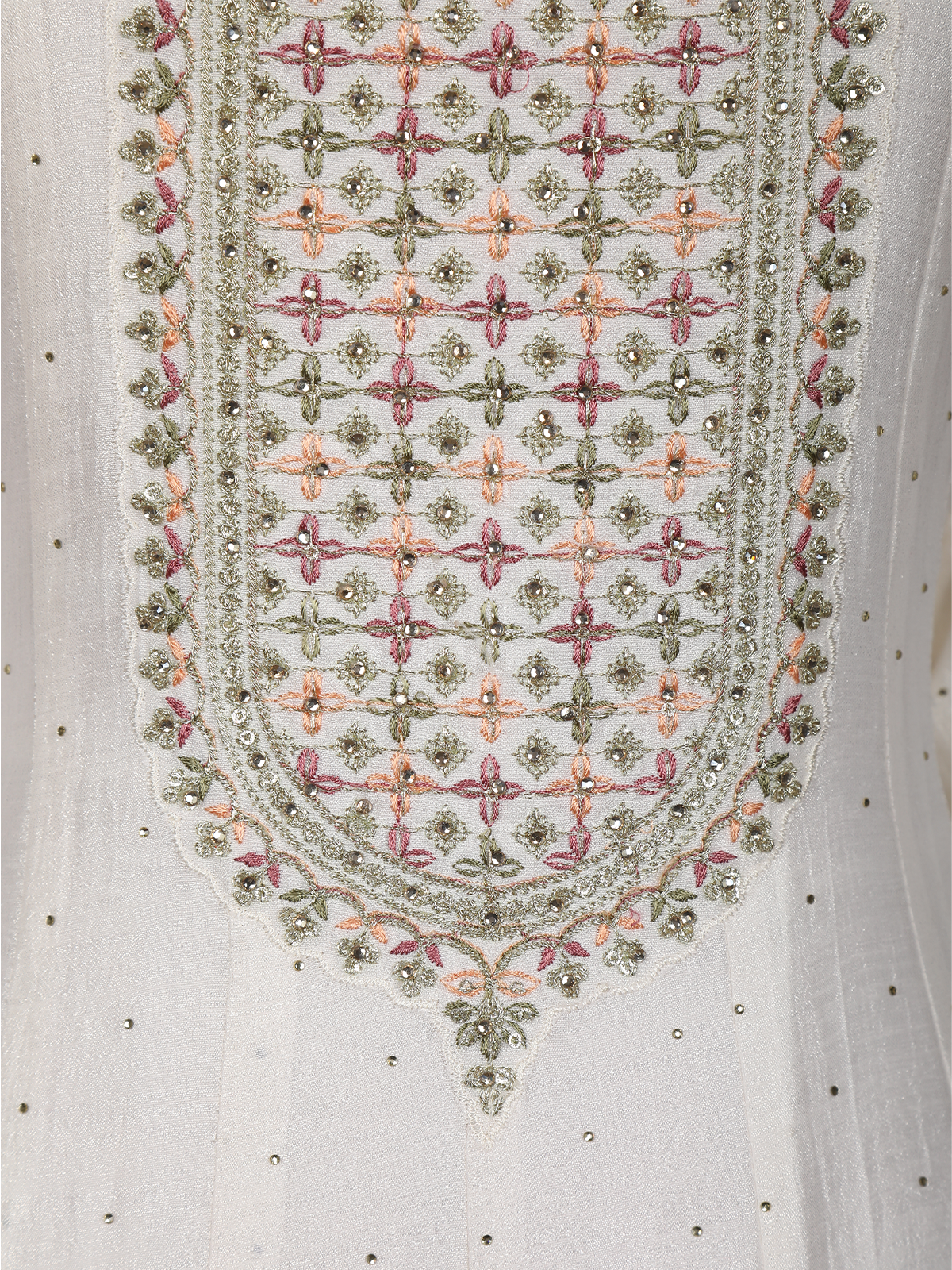 Elevate your festive and occasion wear wardrobe with this graceful off white georgette gown, beautifully adorned with delicate floral embroidery. Crafted to offer effortless elegance, this gown blends soft textures with refined detailing, making it a timeless choice for celebrations and special gatherings.