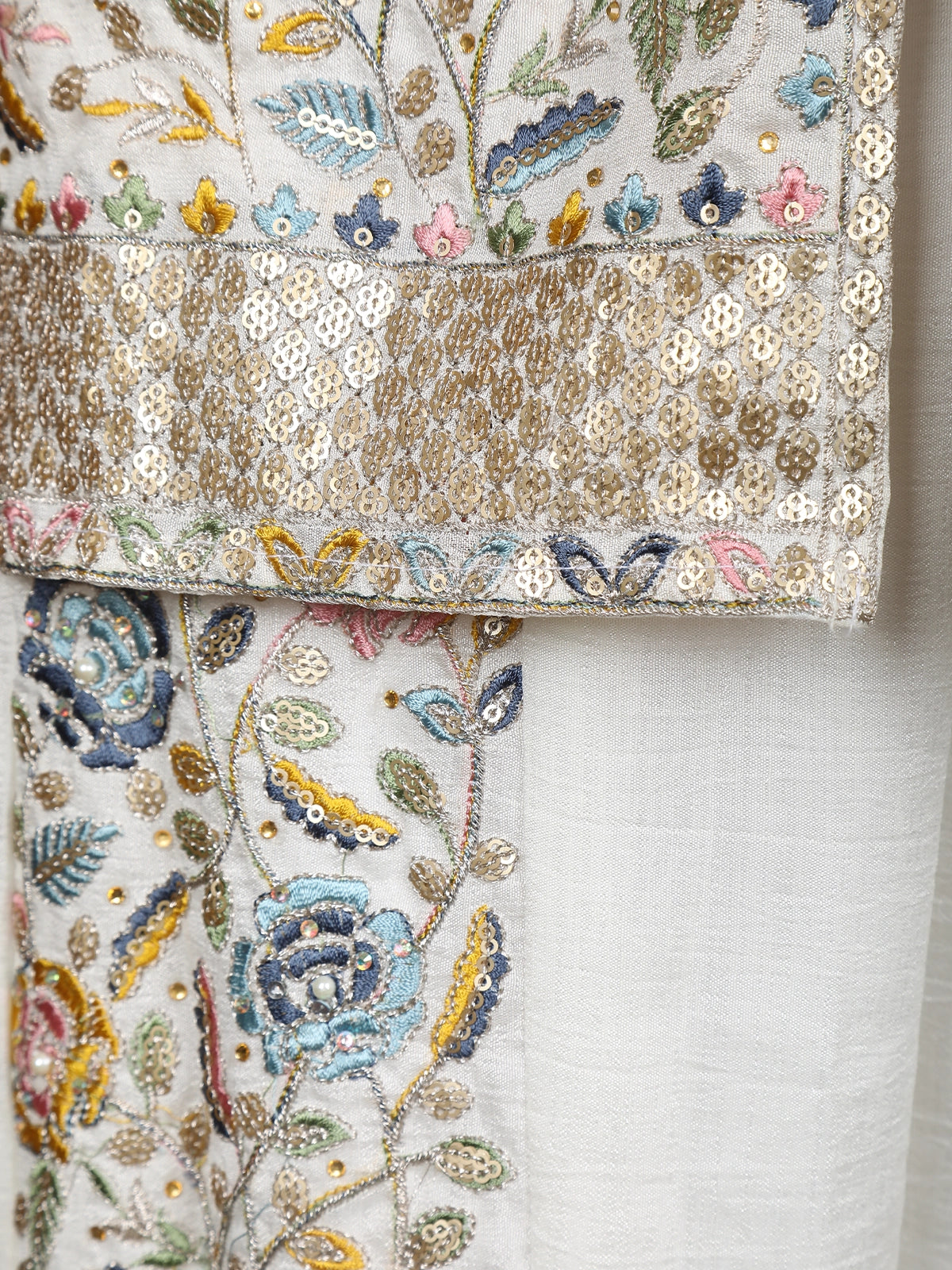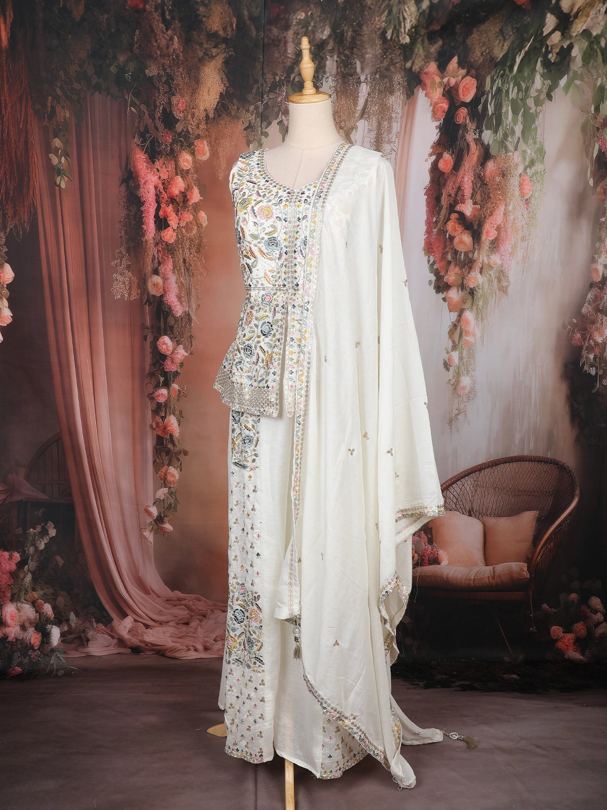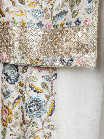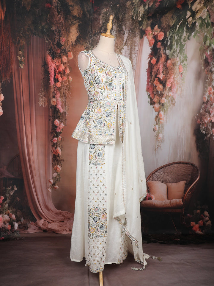 Off-White Floral Embroidered Georgette Peplum Palazzo Suit with Dupatta