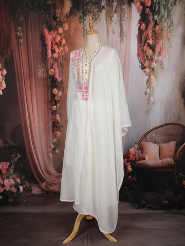 Refresh your ethnic wardrobe with this elegant off-white cotton salwar suit featuring exquisite multicolor thread embroidery on the yoke and sleeves. The soft and breathable fabric ensures all-day comfort, while the vibrant detailing brings a lively charm to your look. Styled with a flattering V-neck and paired with a lightweight matching dupatta, this ensemble is perfect for festive gatherings, casual outings, and everyday elegance.