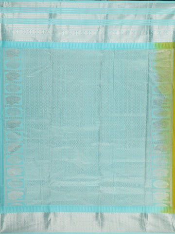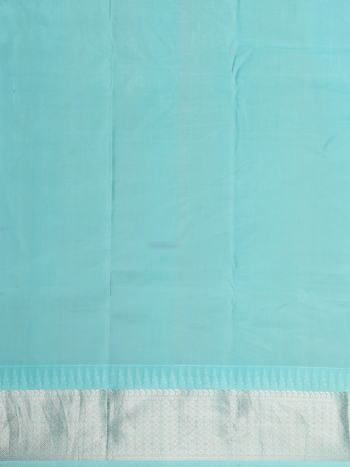 Enhancing its elegance is the striking contrast aqua blue zari border, finely detailed with traditional Kanchipuram craftsmanship that lends a regal finish. The smooth silk texture ensures a structured yet fluid drape, making it both luxurious to look at and comfortable to wear.