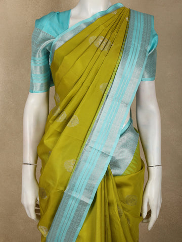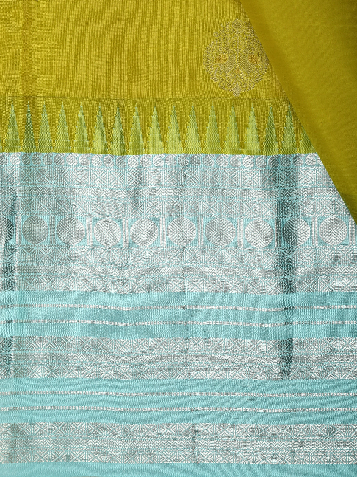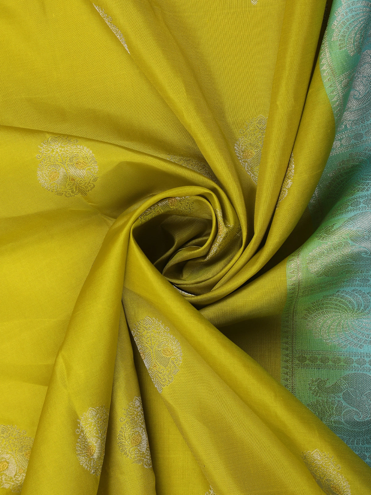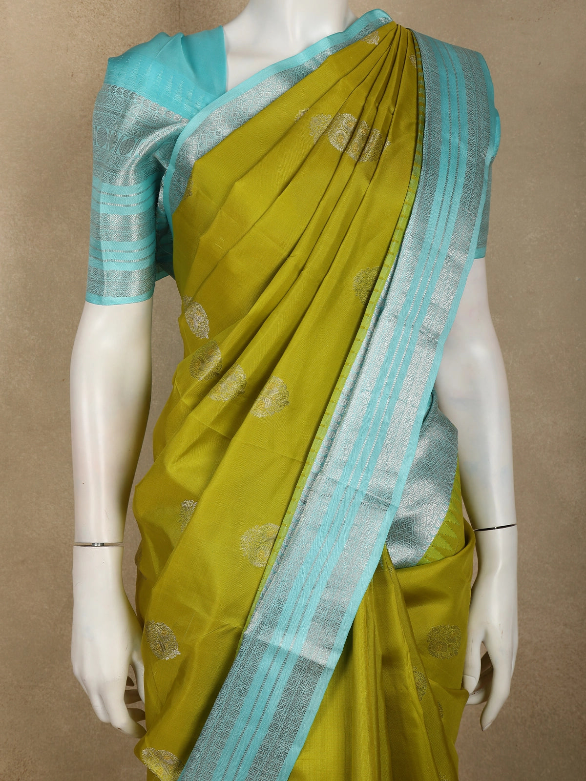 Olive Chartreuse Green Butta Zari Woven Design Pure Kanchipuram Silk Saree with Contrast Zari Border