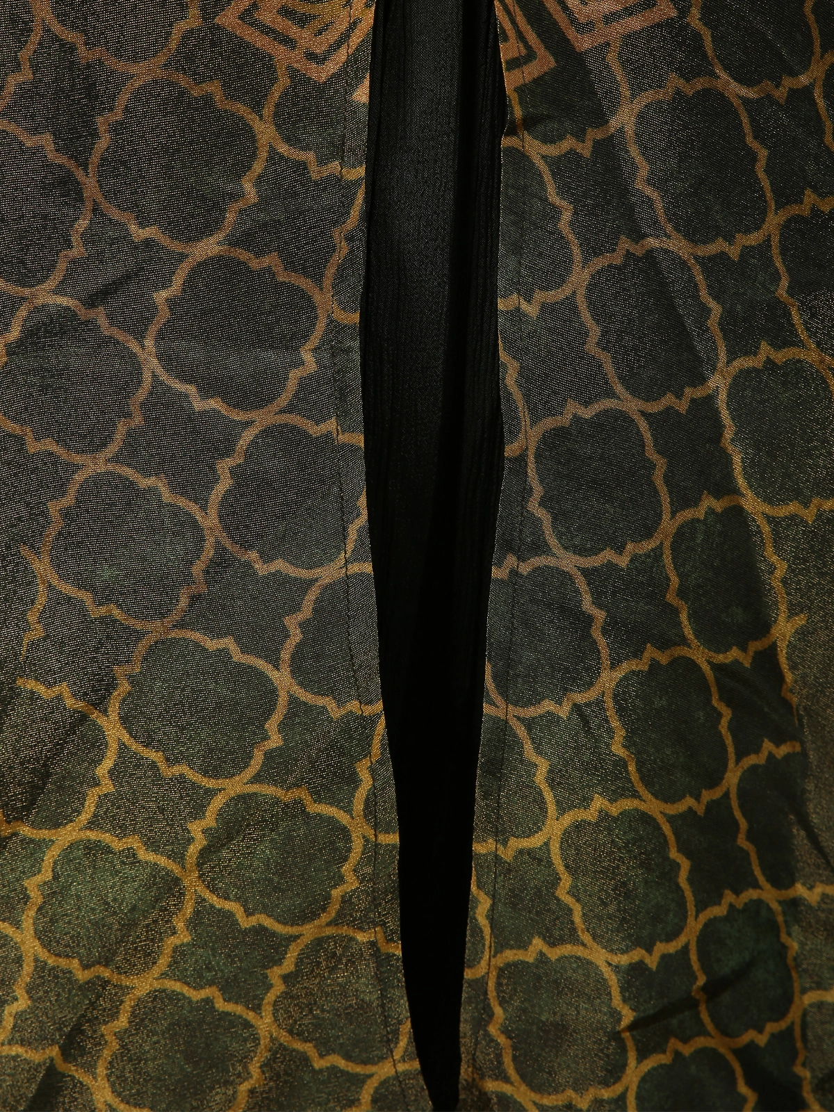 Paired with fluid, wide-leg palazzo pants in a deep forest green shade, the ensemble offers effortless comfort while maintaining a sleek, elongated silhouette. The lightweight tissue dupatta, featuring subtle woven motifs and a soft sheen, completes the look with understated sophistication and graceful movement.
