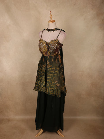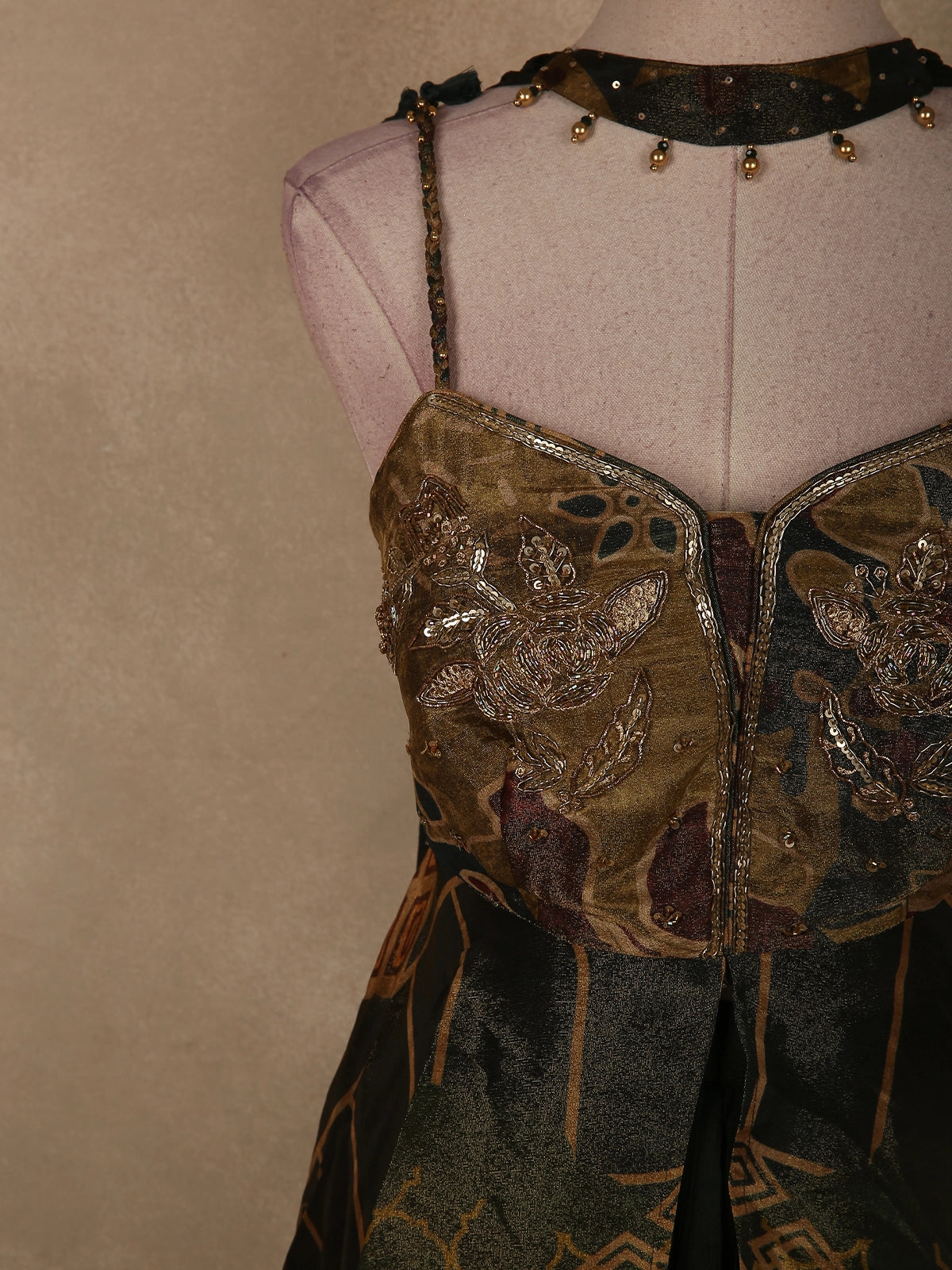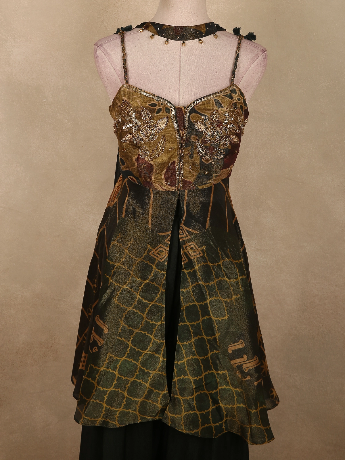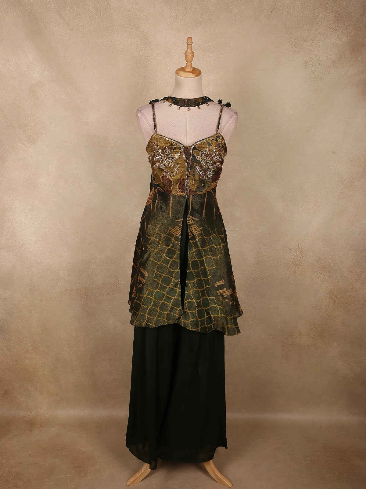 This Olive Forest Green Sequins and Beads Embroidered Design Tissue Palazzo Suit with Dupatta is a refined expression of modern ethnic elegance infused with artisanal charm. The fitted blouse is beautifully adorned with intricate sequins and bead embroidery, creating a delicate shimmer that highlights the earthy olive forest green tone with antique gold accents. The embroidery flows gracefully across the bodice, adding depth and a luxurious handcrafted feel.