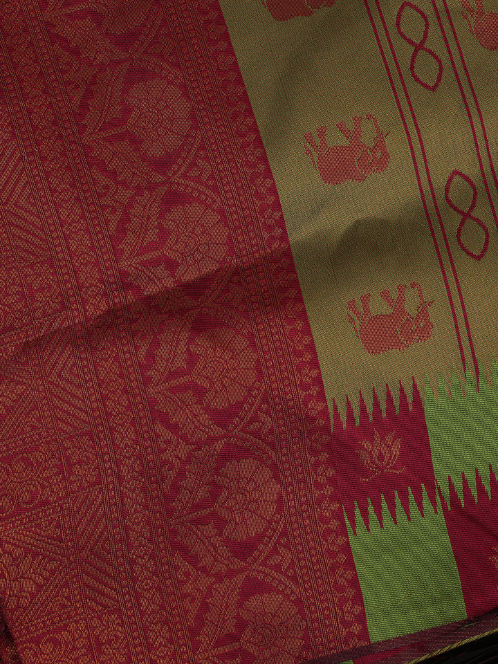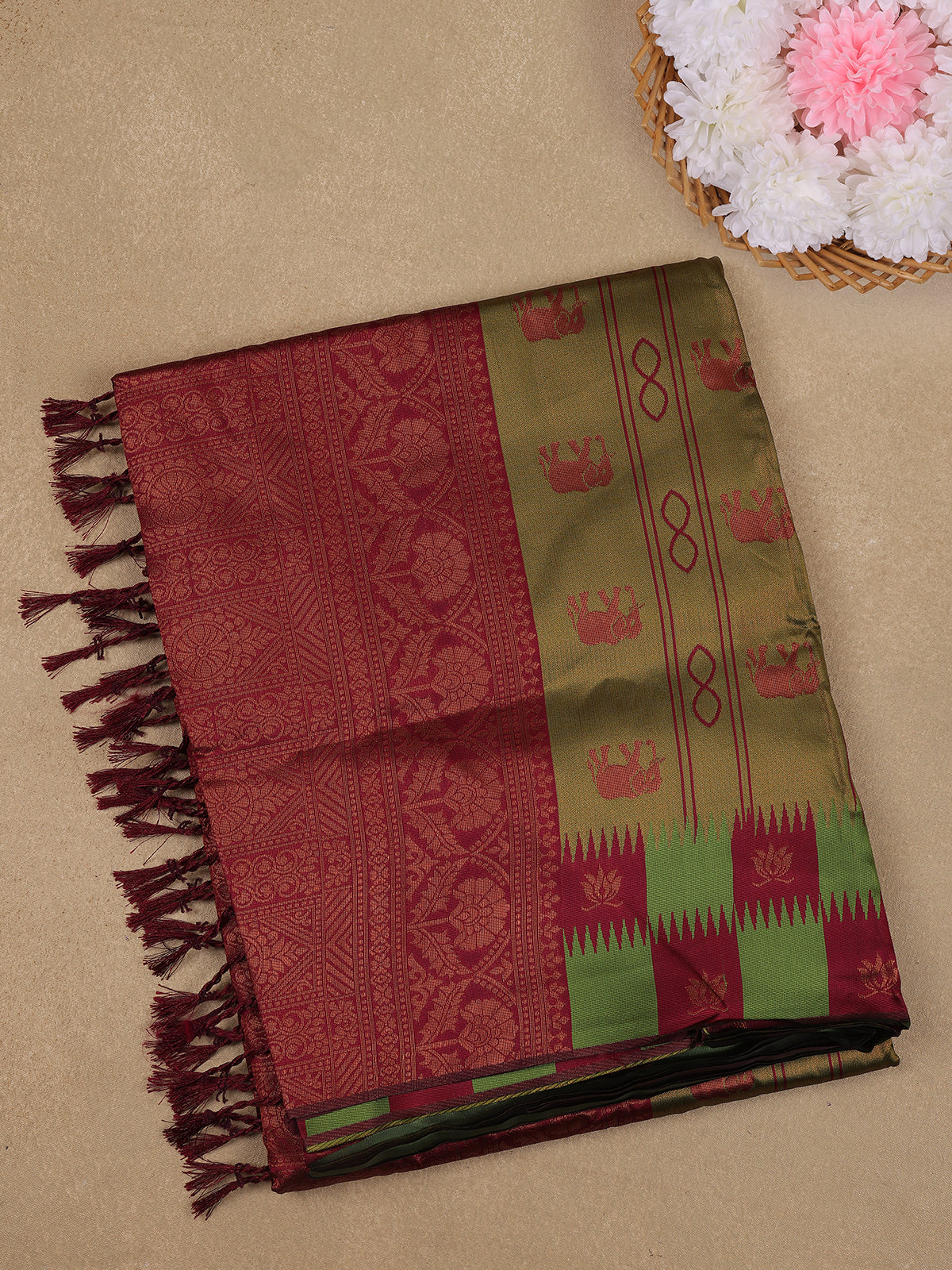 Olive Green and Maroon Elephant Motif Woven Art Silk Saree with Zari Border