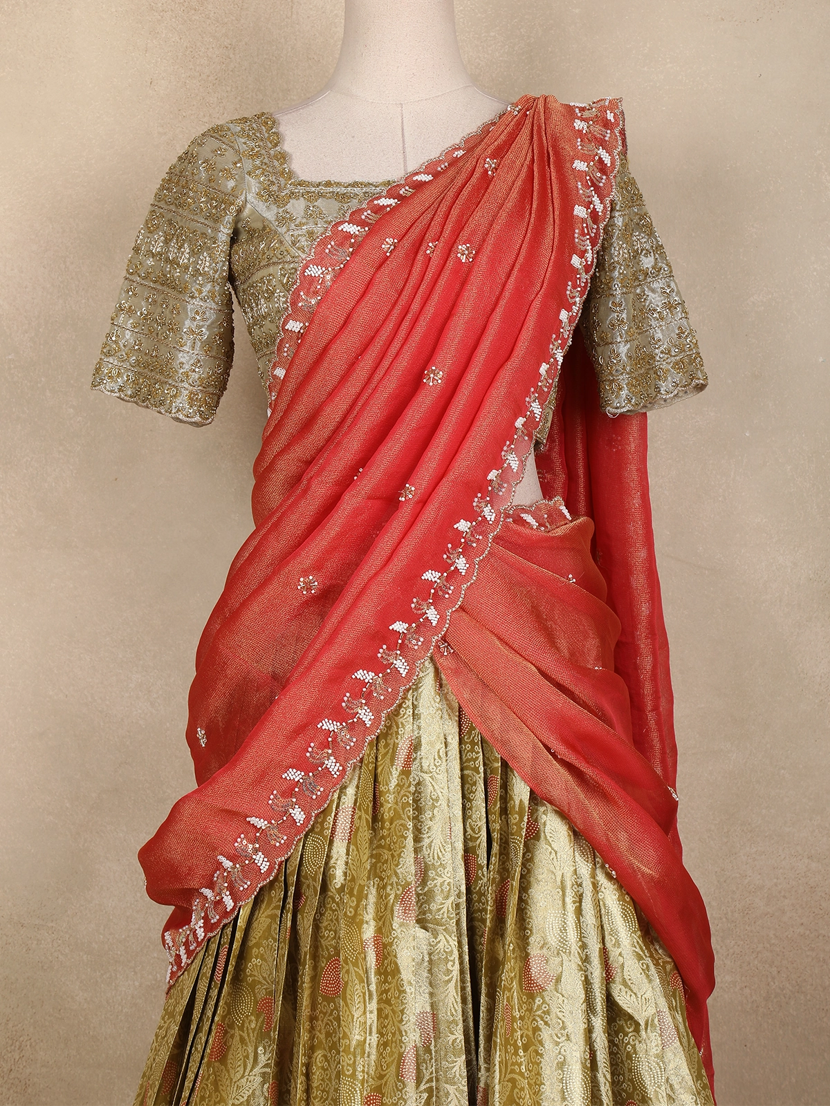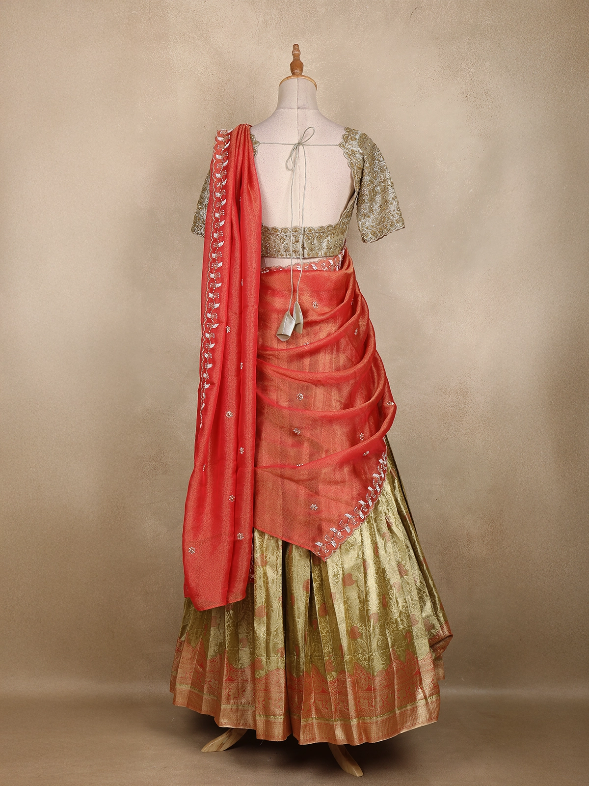 Radiate festive elegance in this Olive Green Woven Silk Lehenga Set, beautifully paired with a soft coral peach draped dupatta for a graceful saree-style silhouette. The lehenga features intricate woven floral and traditional motifs, highlighted with a rich zari border that adds depth and regal charm to every movement.