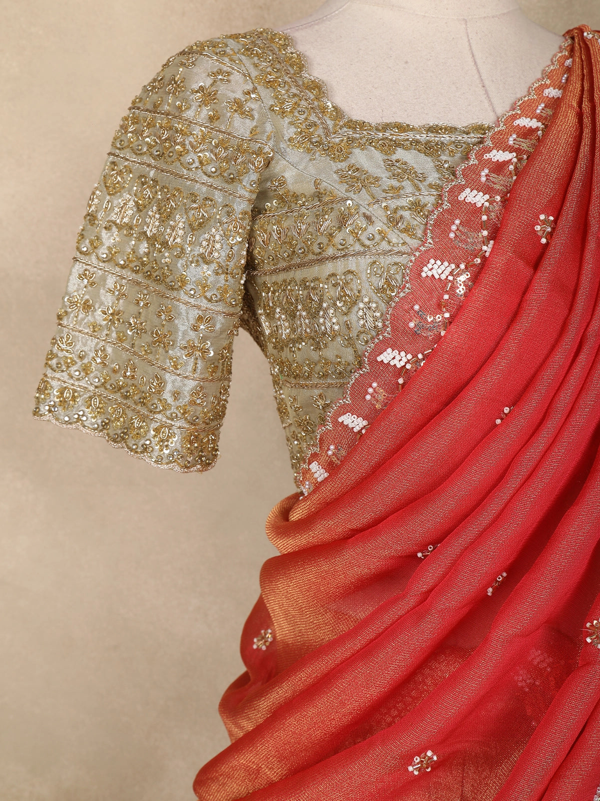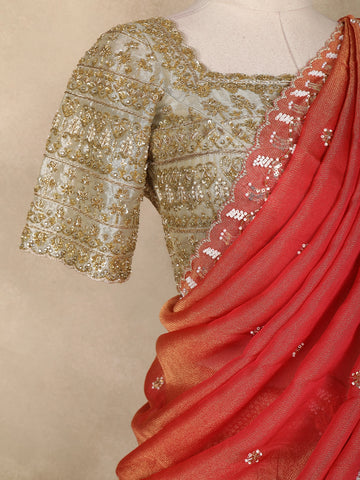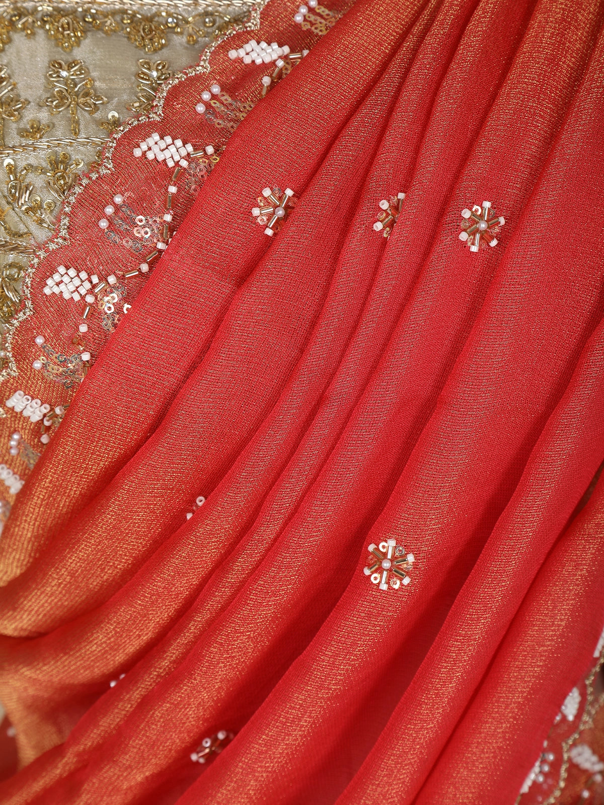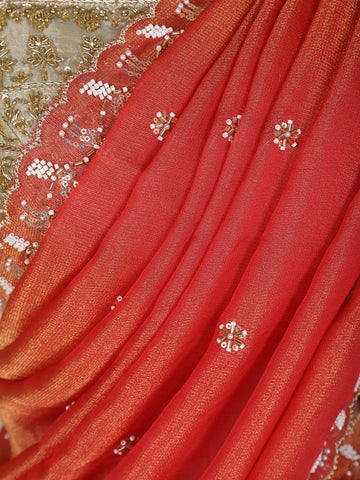 The lightweight coral dupatta is delicately embellished with subtle sequins and finished with an embroidered scalloped border, creating a soft contrast against the opulent lehenga. Complementing the ensemble is a heavily embroidered blouse adorned with fine zari, bead, and sequin work, designed with a classic square neckline and an elegant tie-up back.