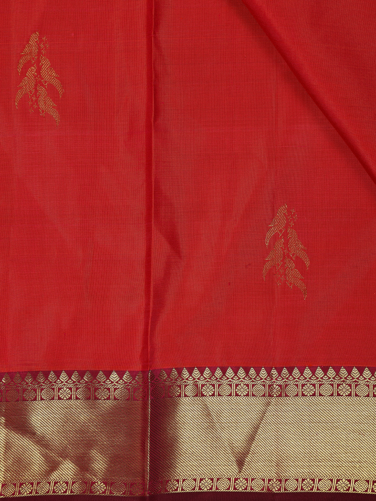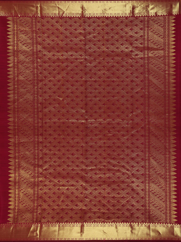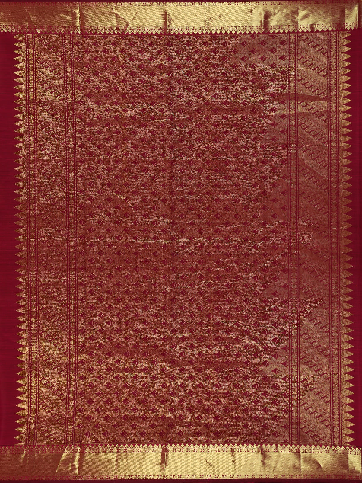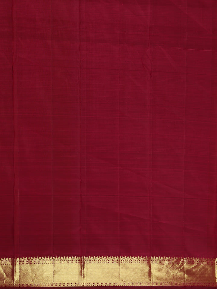 The grand maroon zari pallu enhances the drape’s opulence, making it an ideal choice for weddings, festive rituals, and cultural occasions. Paired with a contrast maroon blouse detailed with zari sleeves, this ensemble radiates heritage charm while offering a statement of refined taste.