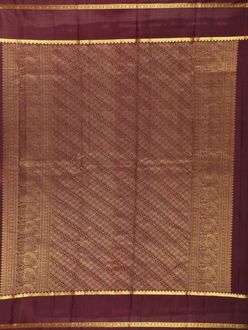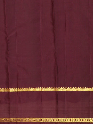 The saree features a maroon zari-rich pallu woven with elaborate motifs and diagonal patterns—an artistic tribute to Kanchipuram craftsmanship. Paired with a matching maroon blouse piece with zari border highlights, this ensemble brings together tradition and sophistication in every drape.