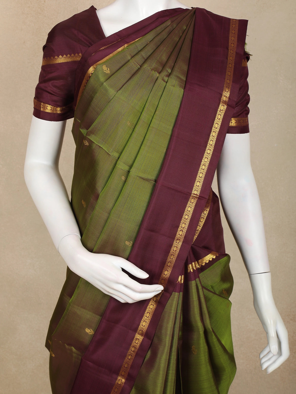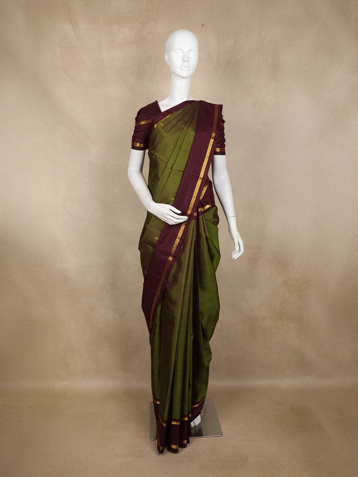 Step into timeless elegance with this exquisite Kanchipuram Silk Saree, beautifully crafted in a majestic olive green shade. Delicate zari woven buttas sprinkled across the body add a traditional charm, creating a look that is subtle yet opulent. The contrasting maroon border enriched with intricate zari patterns enhances its grandeur, making it perfect for festive and wedding occasions.