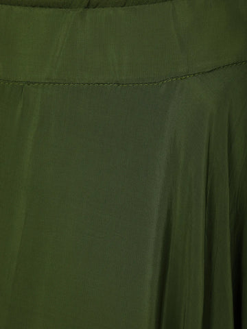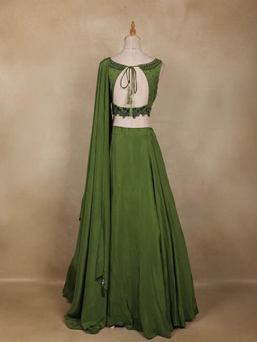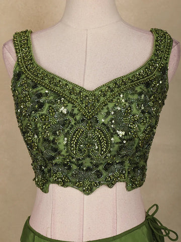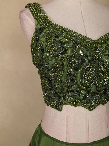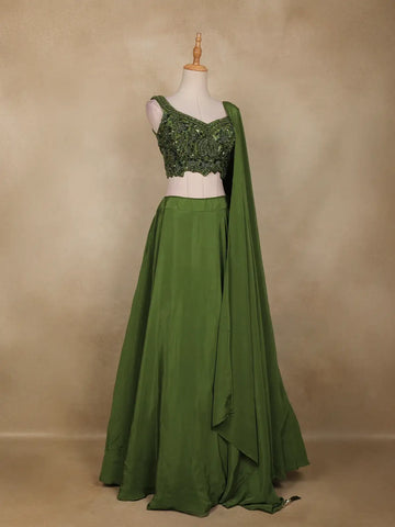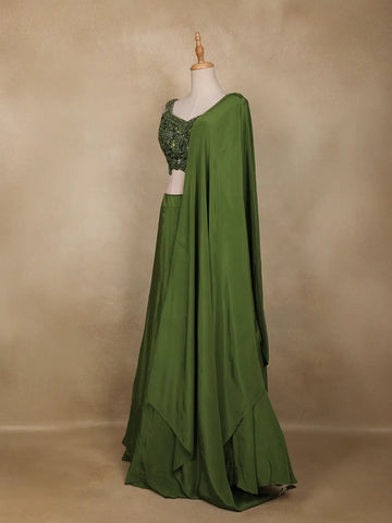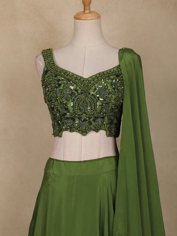 Shine with timeless elegance in this Green Satin Festive Lehenga Set, crafted to make you stand out at every celebration. The smooth satin fabric lends a lustrous sheen and a graceful drape, creating a sophisticated flared silhouette that flows effortlessly.