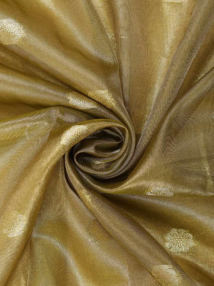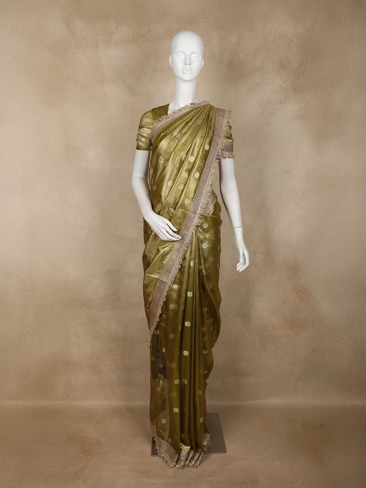 Drape yourself in shimmering luxury with this Olive Green Tissue Saree, gracefully adorned with delicate floral butta motifs that enhance its traditional charm. The fabric offers a glowing sheen, making it a stunning pick for weddings, receptions, and festive occasions.