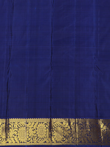 The contrast navy blue pallu and blouse create a striking visual harmony, accentuated by the opulent gold zari border that adds grandeur to every drape. Crafted from premium pure Kanchipuram silk, this saree offers a lustrous texture and an elegant fall—perfect for weddings, festive occasions, and cultural celebrations.