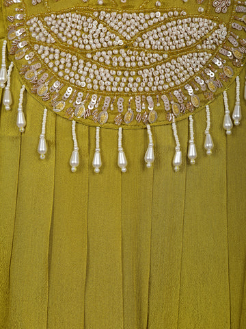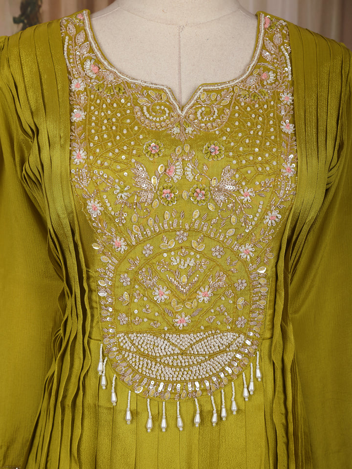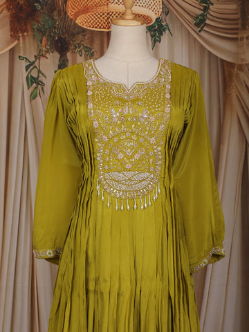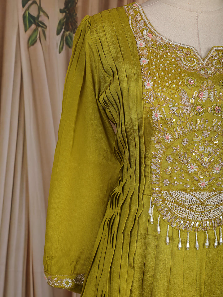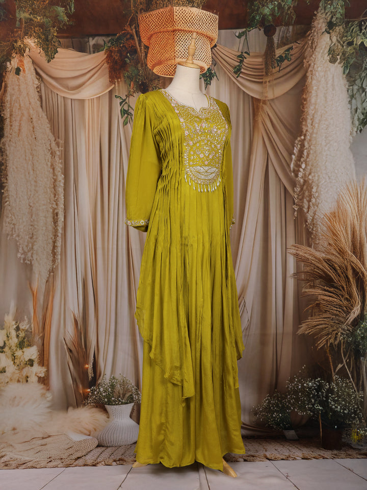 Step into elegance with this vibrant Olive Green Floral Embroidered Chiffon Gown, crafted to bring grace and charm to every celebration. The gown features exquisite floral embroidery that delicately enhances the soft chiffon fabric, giving it a refined, ethereal look. The flowy silhouette drapes beautifully, ensuring effortless movement and a flattering fit. Designed for both comfort and style, this gown is perfect for parties, festive occasions, and special celebrations.