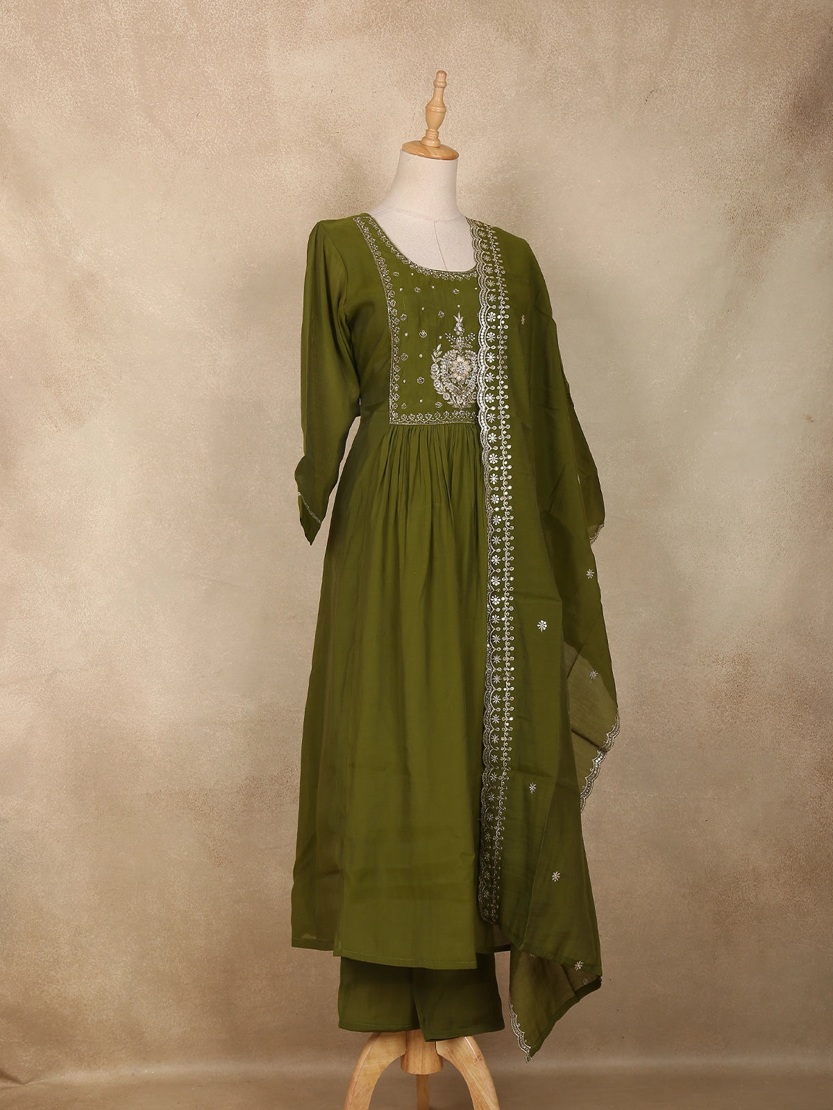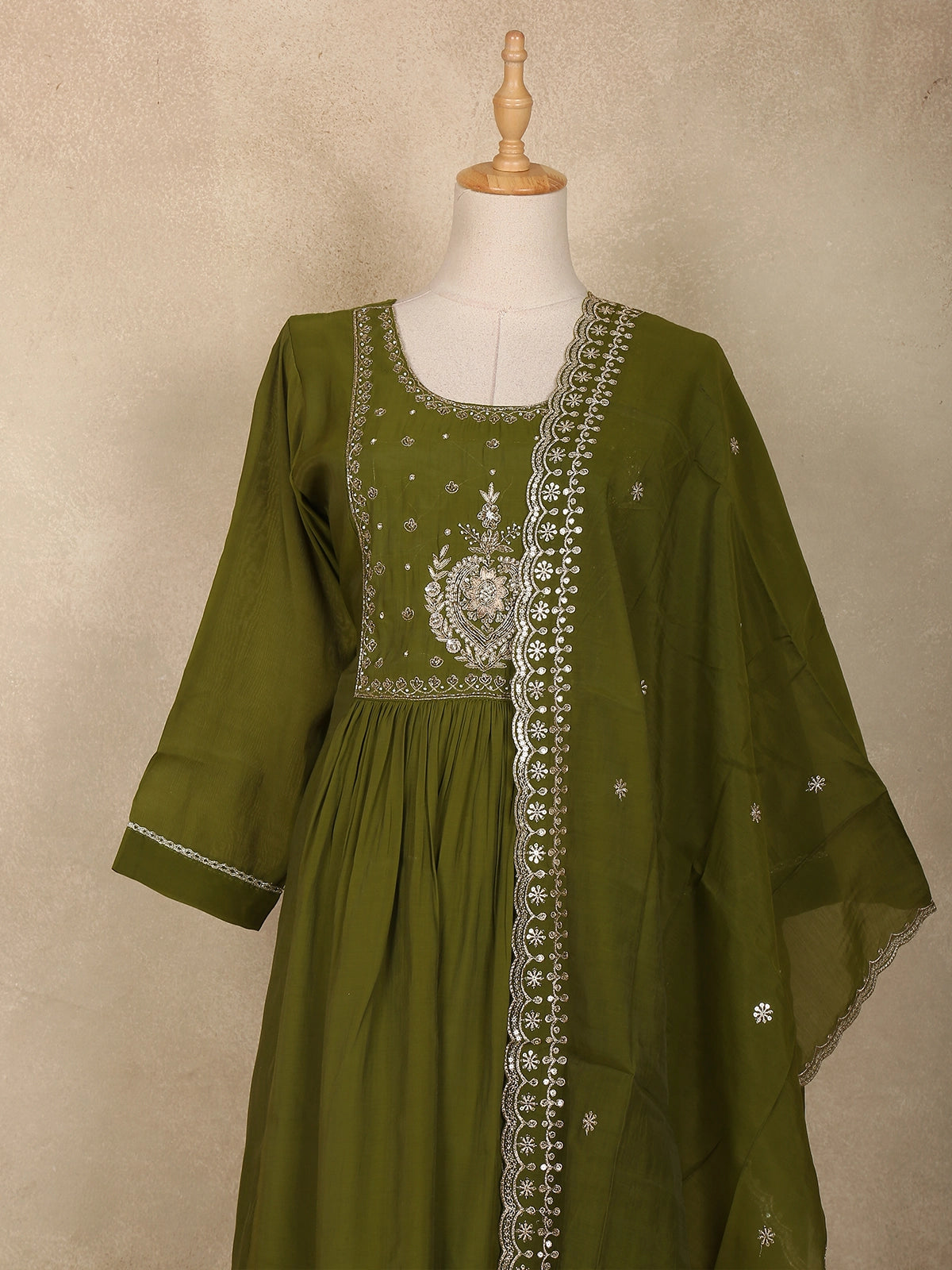 Channel understated elegance with this Olive Green Floral Embroidered Cotton Anarkali Salwar Suit, a perfect combination of simplicity, sophistication, and traditional artistry. The soothing olive hue brings out an earthy charm, while the intricate floral embroidery on the yoke and dupatta border adds a refined touch of grace.