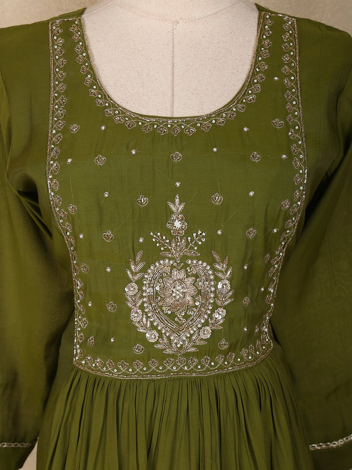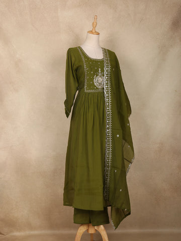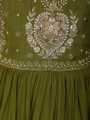 Olive Green Floral Embroidered Design Cotton Anarkali Salwar Suit