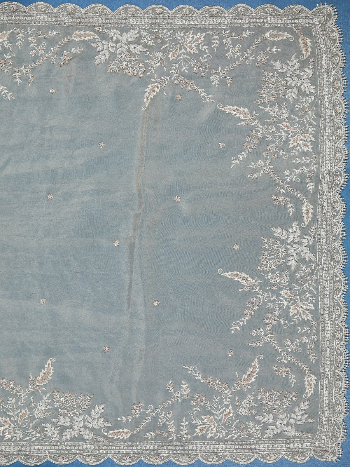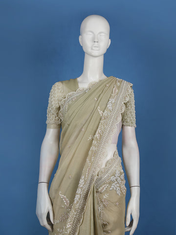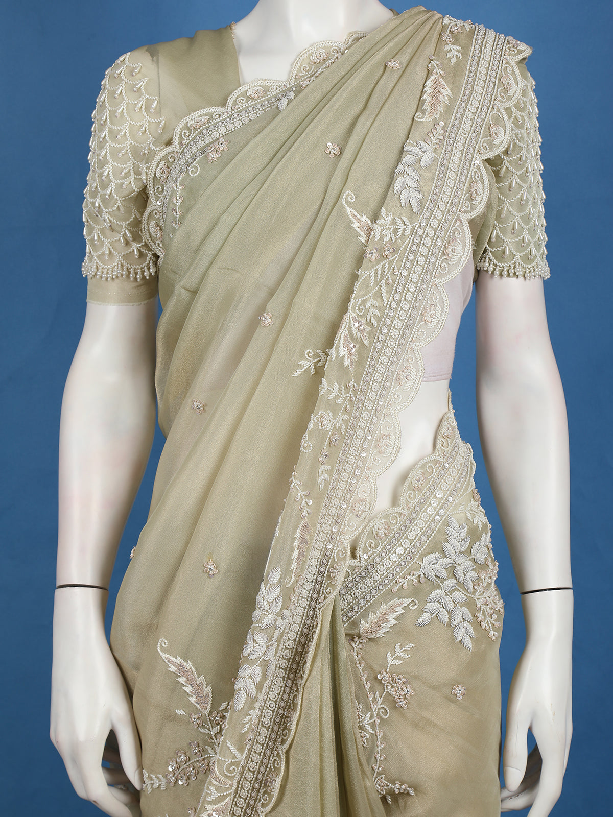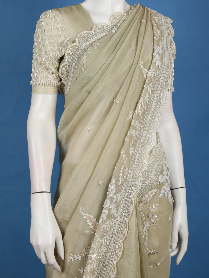 Radiate poise and elegance in this Olive Green Floral Embroidered Net Organza Tissue Saree, a stunning creation that captures the beauty of delicate craftsmanship. The saree features intricate floral thread and bead embroidery, beautifully accentuating the sheer net base with a subtle shimmer. Its scalloped embroidered border adds a refined charm, making it a masterpiece of graceful femininity.